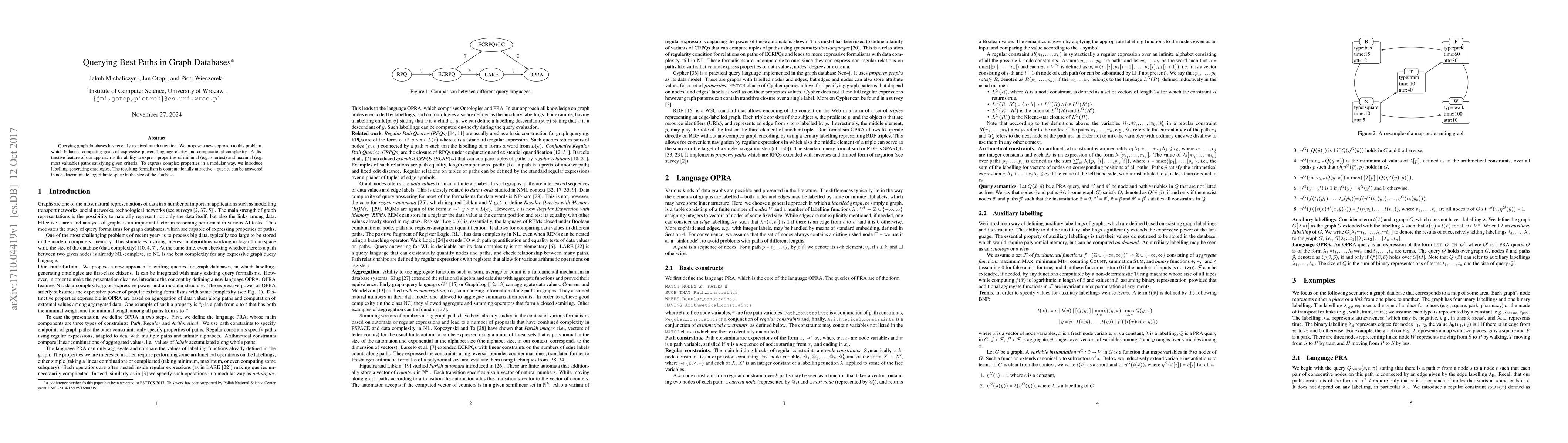 Querying graph databases has recently received much attention. We propose a new approach to this problem, which balances competing goals of expressive power, language clarity and computational complexity. A distinctive feature of our approach is the ability to express properties of minimal (e.g. shortest) and maximal (e.g. most valuable) paths satisfying given criteria. To express complex properties in a modular way, we introduce labelling-generating ontologies. The resulting formalism is computationally attractive -- queries can be answered in non-deterministic logarithmic space in the size of the database.