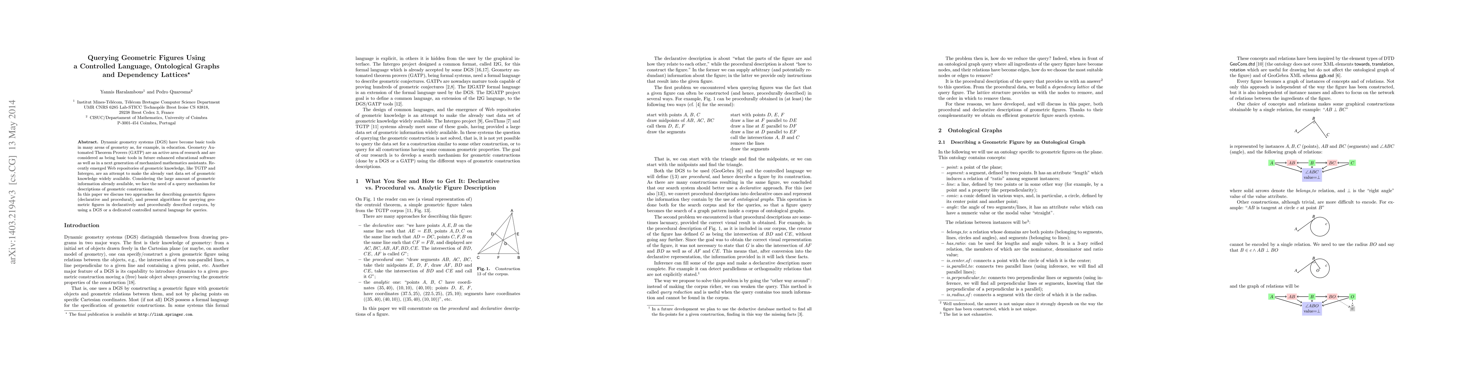 Researchers developed a query mechanism for geometric figures using controlled languages and graphs to make vast geometric knowledge available. They presented algorithms for querying declaratively and procedurally described corpora in dynamic geometry systems.