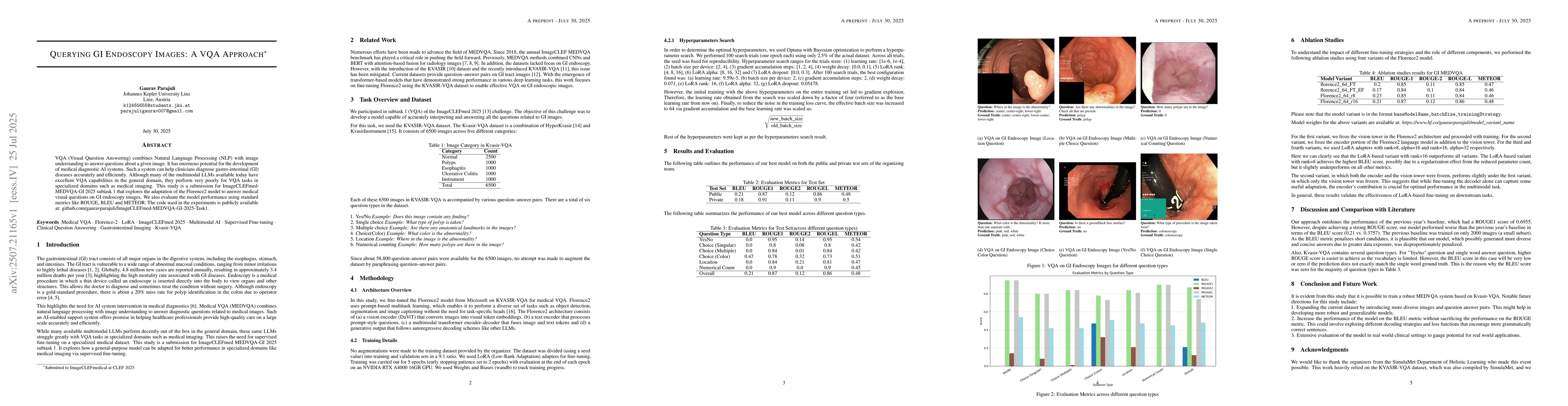 The research fine-tunes the Florence2 model using the KVASIR-VQA dataset for medical visual question answering (VQA) on GI endoscopy images. LoRA (Low-Rank Adaptation) adapters are used for fine-tuning, and hyperparameters are optimized using Optuna with Bayesian optimization.