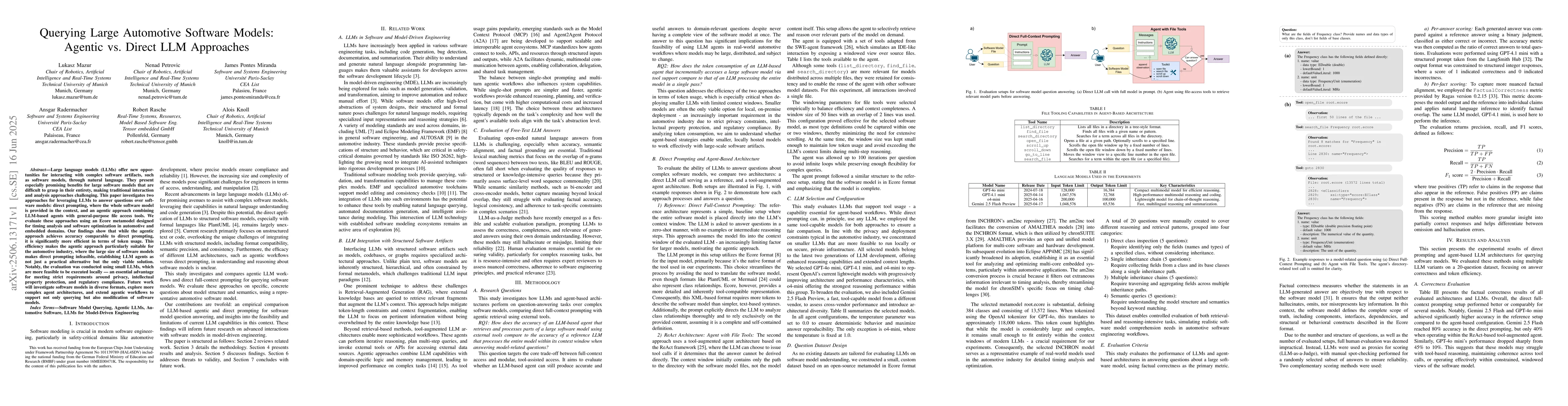 This paper compares two methods using large language models (LLMs) to query large automotive software models: direct prompting and an agentic approach. The agentic method, combining LLM agents with file access tools, proves more efficient in token usage and suitable for large models, unfeasible with direct prompting. The study uses small LLMs for local execution, crucial for automotive industry's privacy and compliance needs.