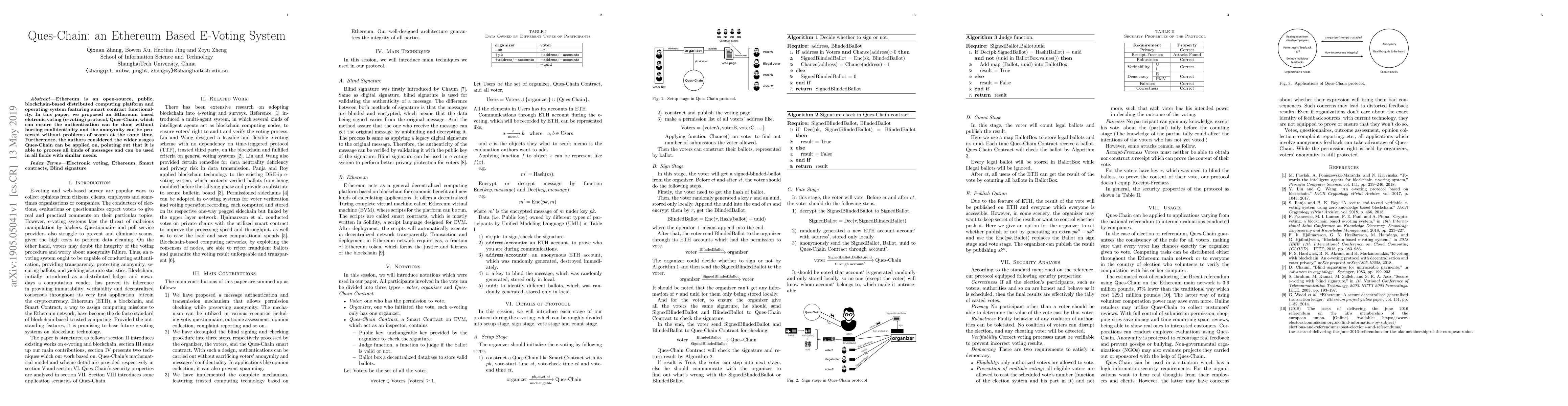 Ques-Chain is an Ethereum-based e-voting system that ensures secure authentication without compromising confidentiality, while protecting anonymity from scams. It can process various messages and be applied in multiple fields with similar needs.