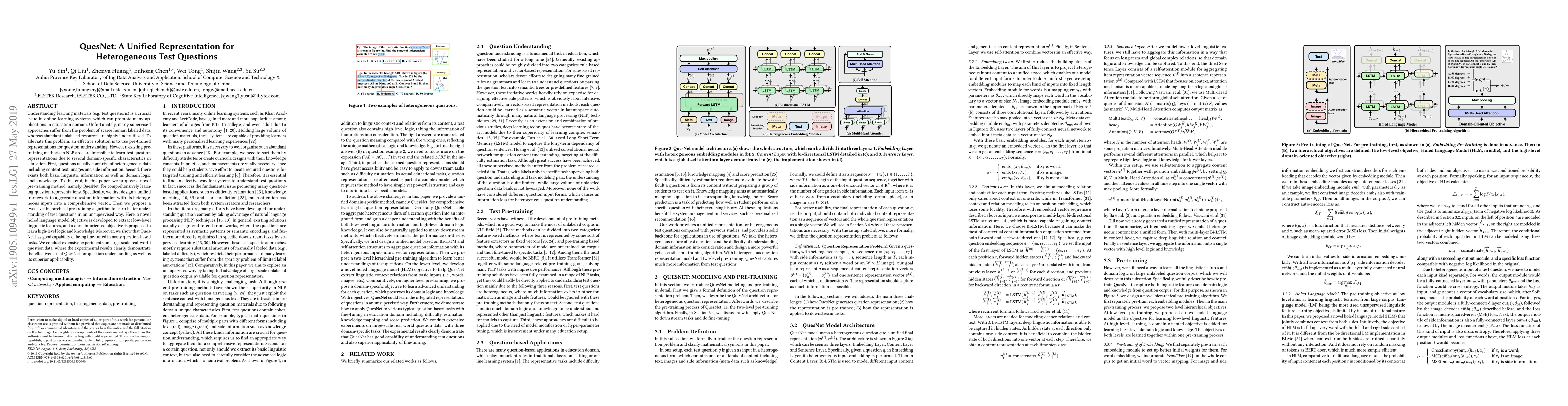 QuesNet is a novel pre-training method designed to learn comprehensive representations of heterogeneous test questions by integrating content text, images, and side information. It employs a two-level hierarchical pre-training algorithm to extract both linguistic features and domain-specific knowledge, demonstrating effectiveness in real-world question-based tasks.