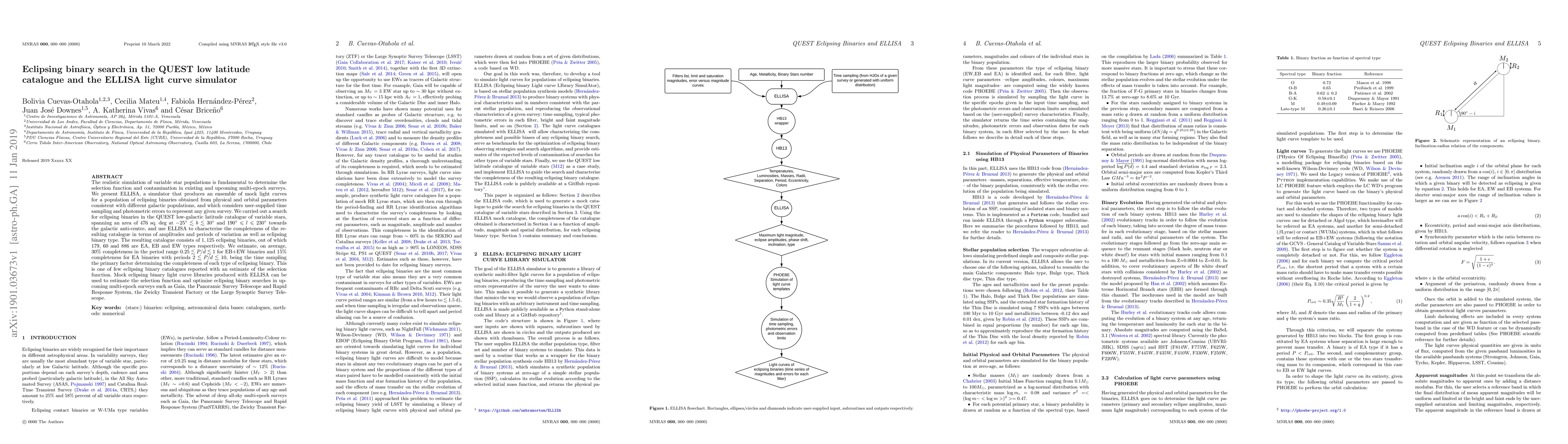 This paper introduces \ellisa, a simulator for generating mock light curves of eclipsing binaries, and reports a search for such binaries in the QUEST catalogue. The study estimates the catalogue's completeness at around 30% for EB+EW binaries and 15% for EA binaries, with time sampling being the main factor affecting completeness.