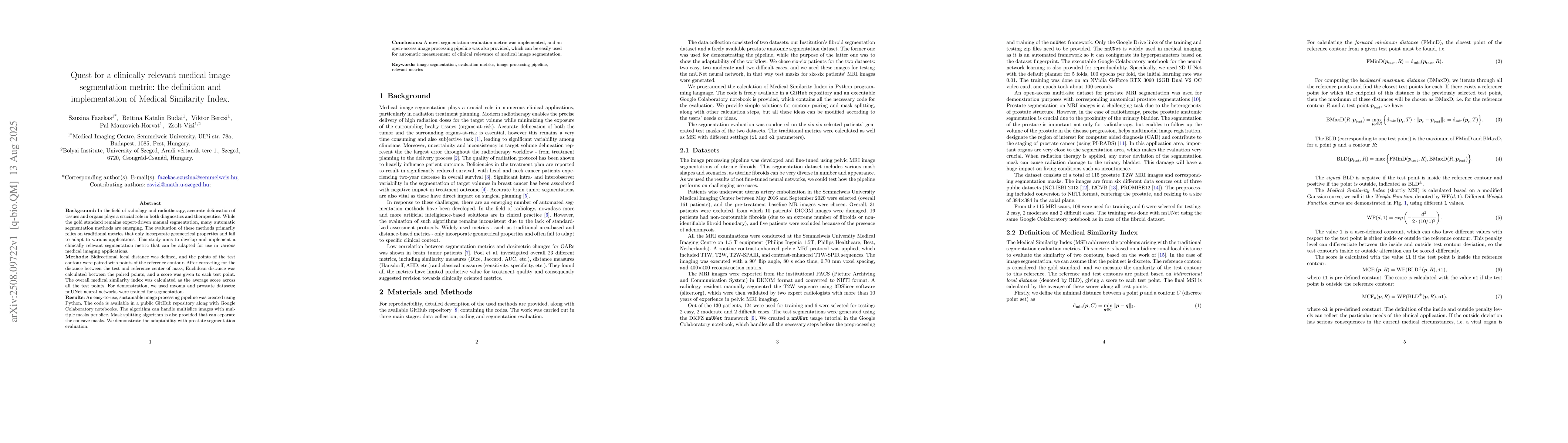 Background: In the field of radiology and radiotherapy, accurate delineation of tissues and organs plays a crucial role in both diagnostics and therapeutics. While the gold standard remains expert-driven manual segmentation, many automatic segmentation methods are emerging. The evaluation of these methods primarily relies on traditional metrics that only incorporate geometrical properties and fail to adapt to various applications. Aims: This study aims to develop and implement a clinically relevant segmentation metric that can be adapted for use in various medical imaging applications. Methods: Bidirectional local distance was defined, and the points of the test contour were paired with points of the reference contour. After correcting for the distance between the test and reference center of mass, Euclidean distance was calculated between the paired points, and a score was given to each test point. The overall medical similarity index was calculated as the average score across all the test points. For demonstration, we used myoma and prostate datasets; nnUNet neural networks were trained for segmentation. Results: An easy-to-use, sustainable image processing pipeline was created using Python. The code is available in a public GitHub repository along with Google Colaboratory notebooks. The algorithm can handle multislice images with multiple masks per slice. Mask splitting algorithm is also provided that can separate the concave masks. We demonstrate the adaptability with prostate segmentation evaluation. Conclusions: A novel segmentation evaluation metric was implemented, and an open-access image processing pipeline was also provided, which can be easily used for automatic measurement of clinical relevance of medical image segmentation.}