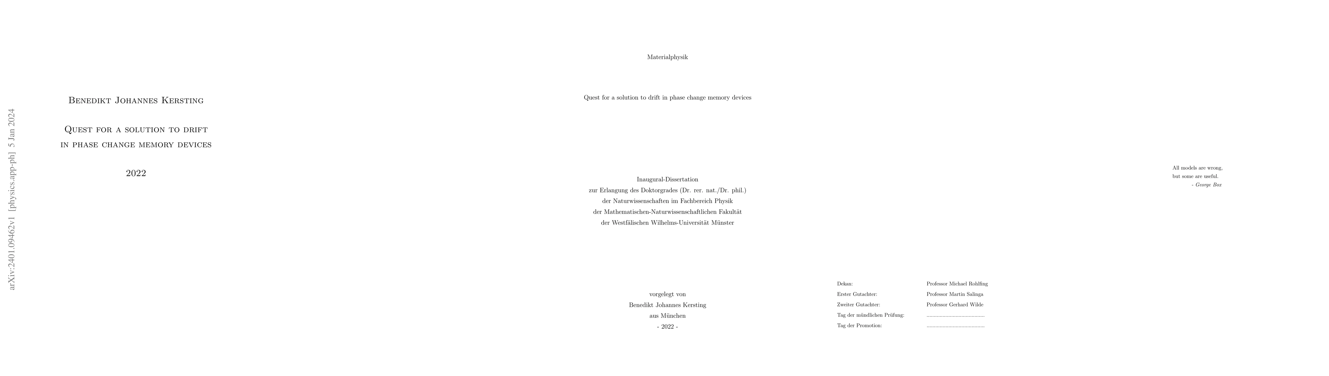 This research investigates the drift phenomenon in phase change memory devices through extensive experimental characterization and modeling. It explores the origins of structural relaxation, assesses nanoscale effects, and tests new device concepts to mitigate drift, identifying key factors like confinement, material properties, and contact resistance.
