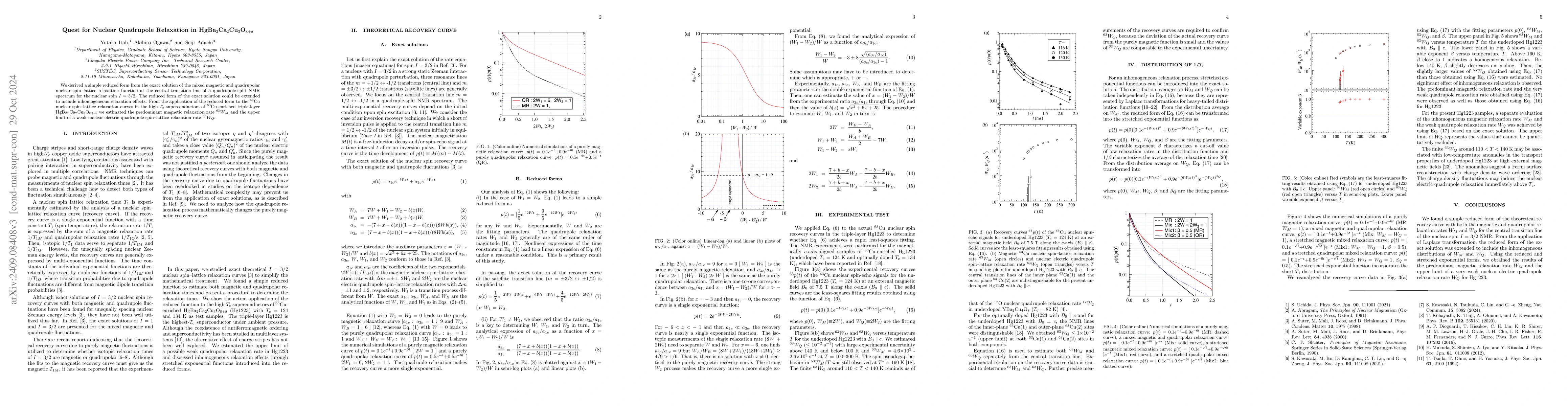 We derived a simple reduced form from the exact solution of the mixed magnetic and quadrupolar nuclear spin--lattice relaxation function at the central transition line of a quadrupole-split NMR spectrum for the nuclear spin $I$ = 3/2. The reduced form of the exact solution could be extended to include inhomogeneous relaxation effects. From the application of the reduced form to the $^{63}$Cu nuclear spin--lattice relaxation curves in the high-$T_\mathrm{c}$ superconductors of $^{63}$Cu-enriched triple-layer HgBa$_2$Ca$_2$Cu$_3$O$_{8+\delta}$, we estimated the predominant magnetic relaxation rate $^{63}W_M$ and the upper limit of a weak nuclear electric quadrupole spin--lattice relaxation rate $^{63}W_Q$.