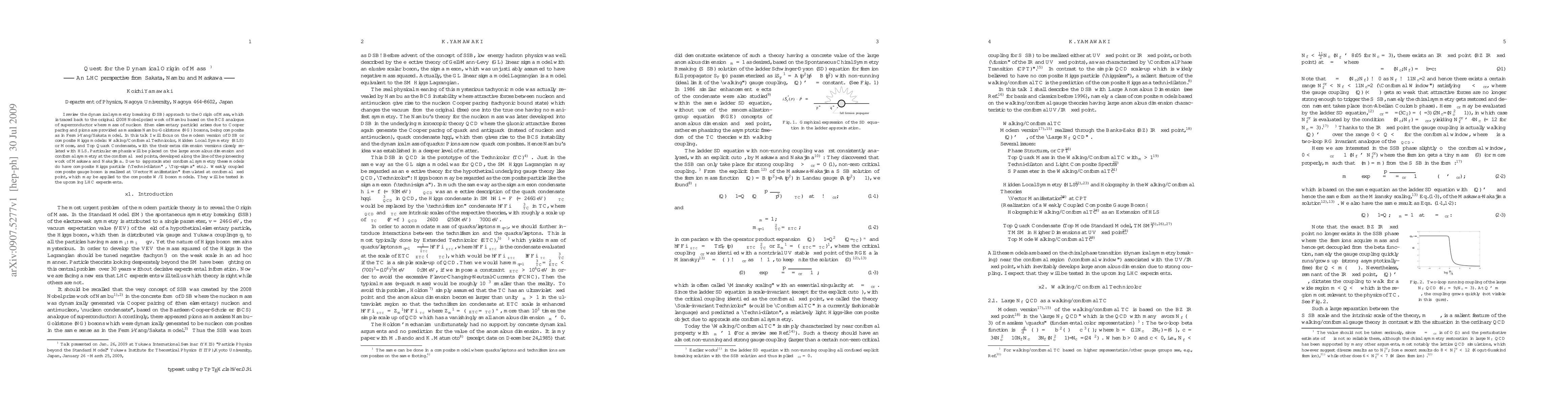 I review the dynamical symmetry breaking (DSB) approach to the Origin of Mass, which is traced back to the original (2008 Nobel prize) work of Nambu based on the BCS analogue of superconductor where mass of nucleon (then elementary particle) arises due to Cooper paring and pions are provided as massless Nambu-Goldstone (NG) bosons, being composite as in Fermi-Yang/Sakata model. In this talk I will focus on the modern version of DSB or composite Higgs models: Walking/Conformal Technicolor, Hidden Local Symmetry (HLS) or Moose, and Top Quark Condensate, with the their extra dimension versions closely related with HLS. Particular emphasis will be placed on the large anomalous dimension and conformal symmetry at the conformal fixed points, developed along the line of the pioneering work of Maskawa and Nakajima. Due to (approximate) conformal symmetry these models do have composite Higgs particle ("Techni-dilaton", "Top-sigma" etc.). Weakly coupled composite gauge boson is realized at "Vector Manifestation" formulated at conformal fixed point, which may be applied to the composite W/Z boson models. They will be tested in the upcoming LHC experiments.