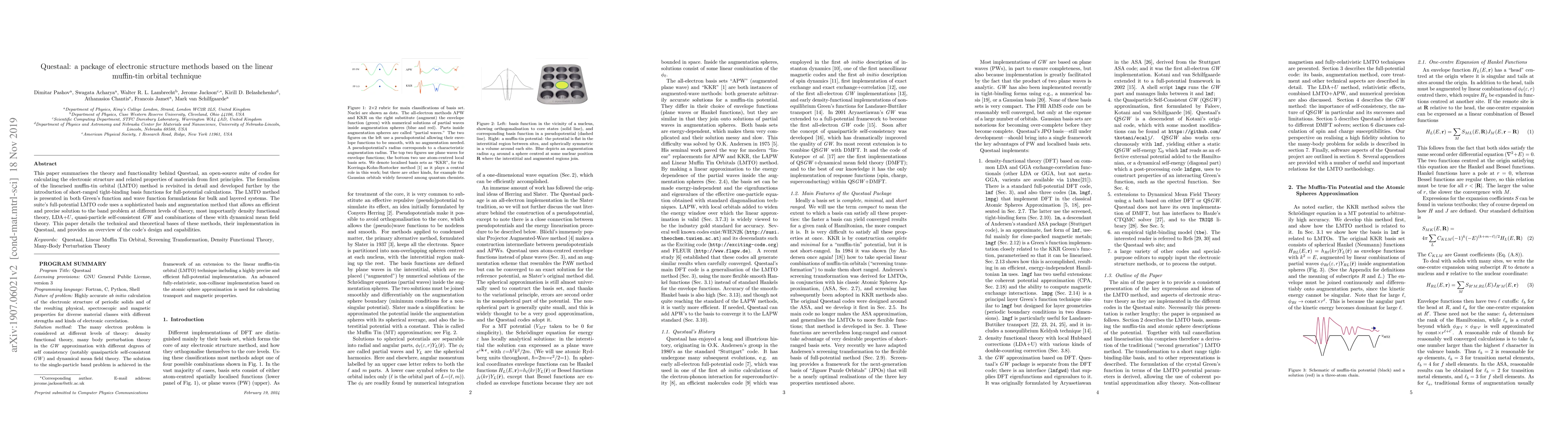 Questaal is an open-source suite for calculating electronic structures using the linear muffin-tin orbital (LMTO) method, enhanced with short-ranged tight-binding functions for full-potential calculations. It supports various theoretical frameworks including density functional theory and quasi-particle methods.