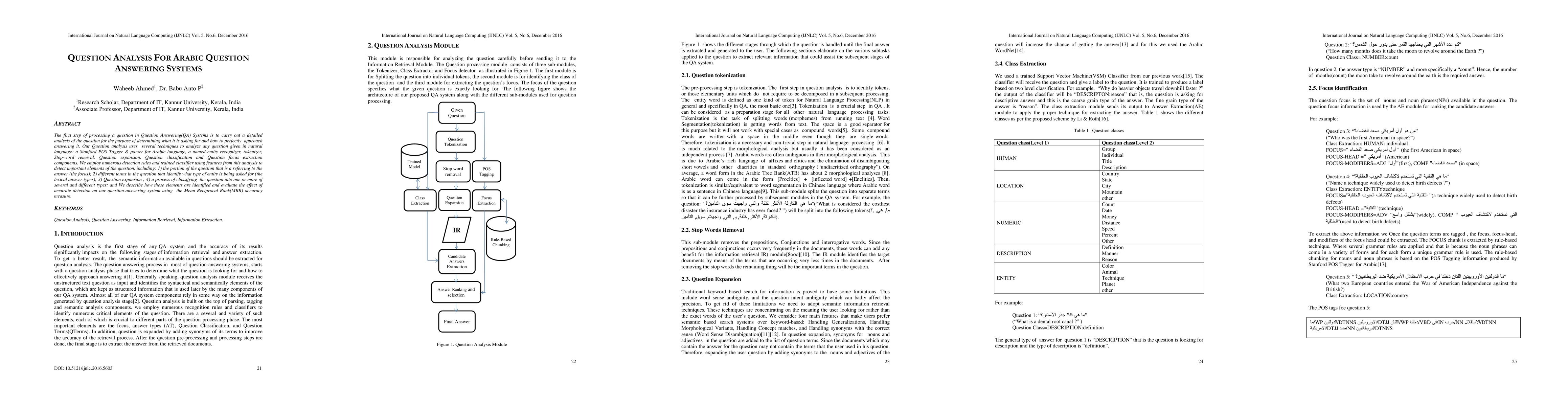 This research develops techniques for analyzing Arabic questions to improve question answering systems, employing methods like POS tagging, named entity recognition, and question classification. The study evaluates the effectiveness of these techniques on question focus extraction and overall system accuracy using Mean Reciprocal Rank (MRR).