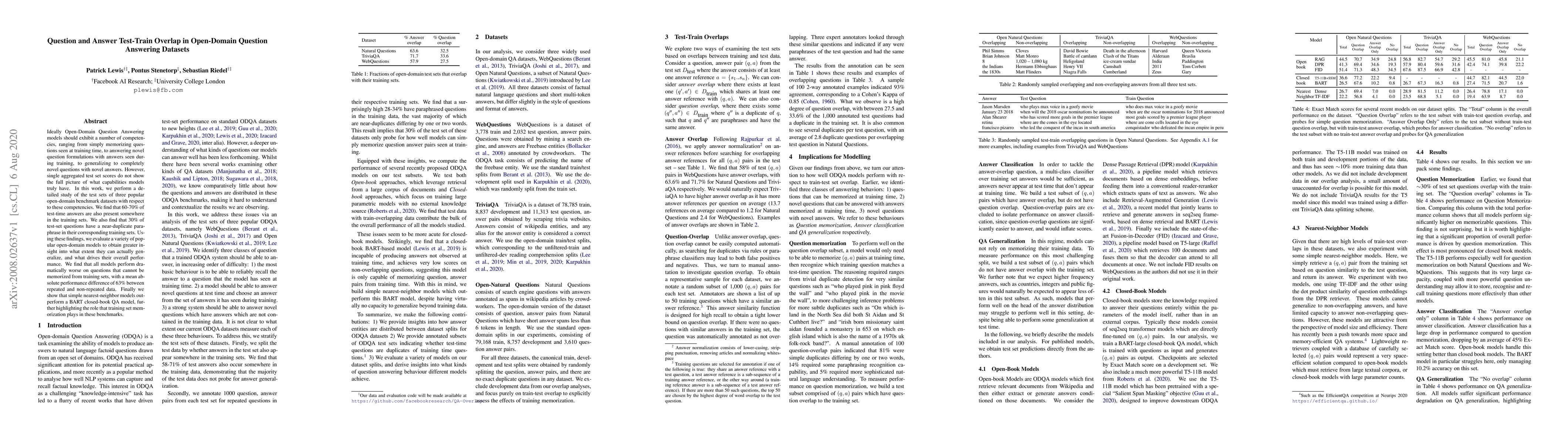 Open-domain question answering models can memorize 60-70% of test-time answers from their training sets, but perform poorly on novel questions. Simple nearest-neighbor models out-perform complex QA models in certain scenarios.