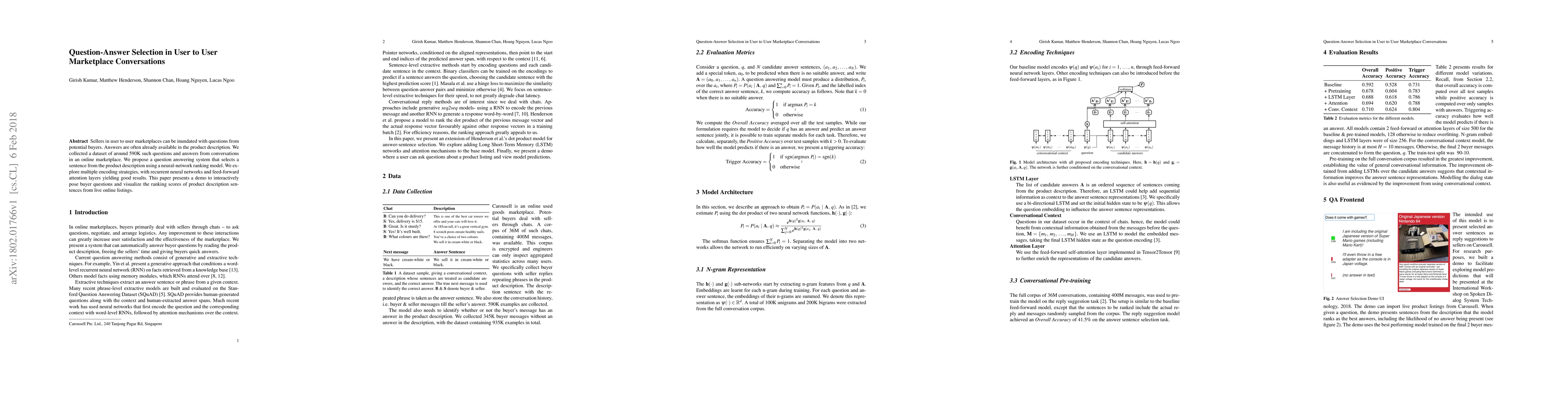 This paper proposes a neural-network ranking model to select relevant sentences from product descriptions to answer buyer questions in user-to-user marketplaces. The model, employing recurrent neural networks and attention layers, demonstrates effective performance, as showcased in a demo that visualizes ranking scores from live listings.