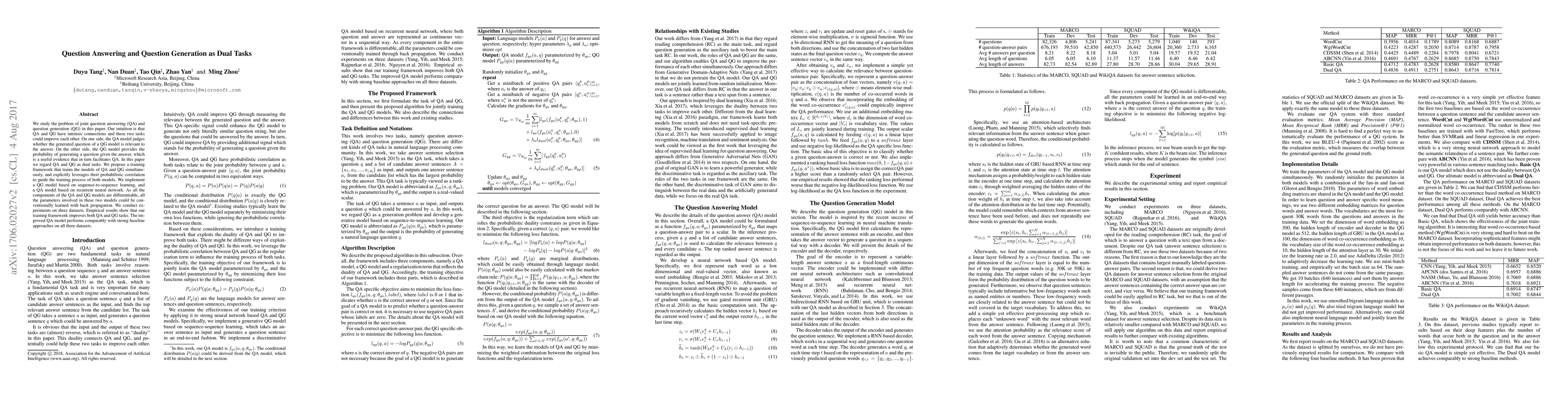 This paper explores how jointly training question answering (QA) and question generation (QG) models can improve both tasks through their probabilistic correlation. Joint training improves the QA model's performance comparably to strong baselines on three datasets.