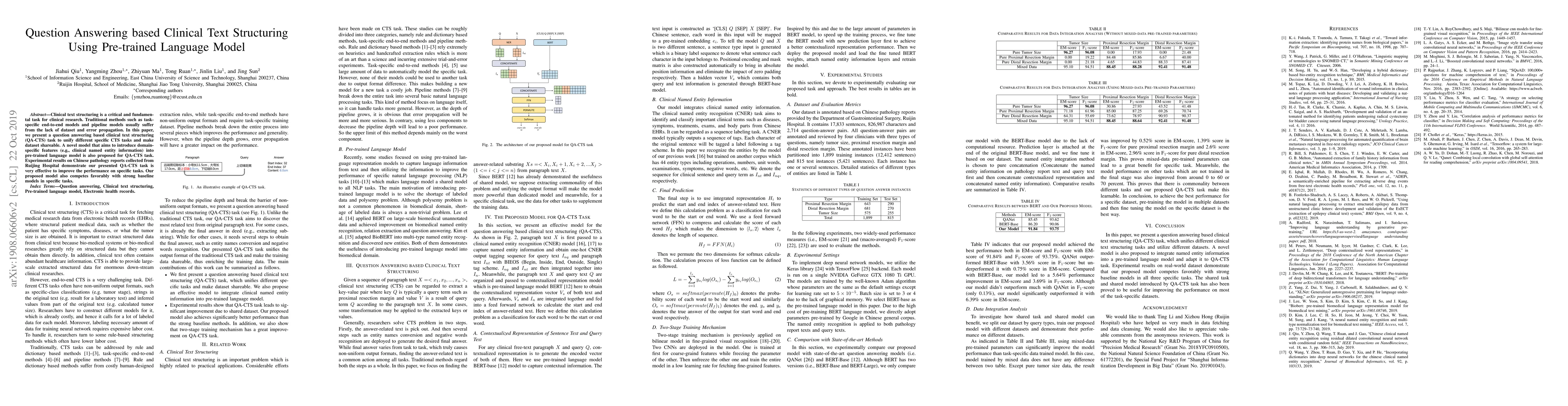 This paper introduces a question answering based clinical text structuring (QA-CTS) task to unify various clinical text structuring tasks and enhance dataset shareability. A novel model incorporating domain-specific features into a pre-trained language model is proposed, which shows competitive performance on Chinese pathology reports, outperforming traditional methods.
