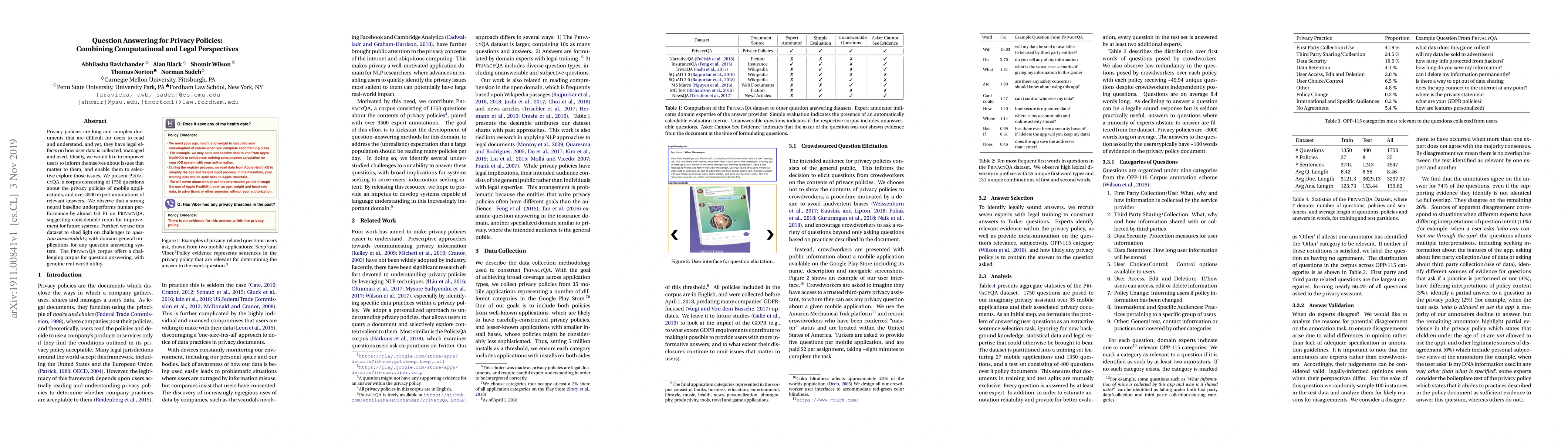 This paper introduces PrivacyQA, a dataset of 1750 questions about mobile app privacy policies and 3500 expert answers, highlighting the difficulty of understanding these complex documents. It finds that current neural models underperform humans, indicating significant room for improvement in question answering systems.
