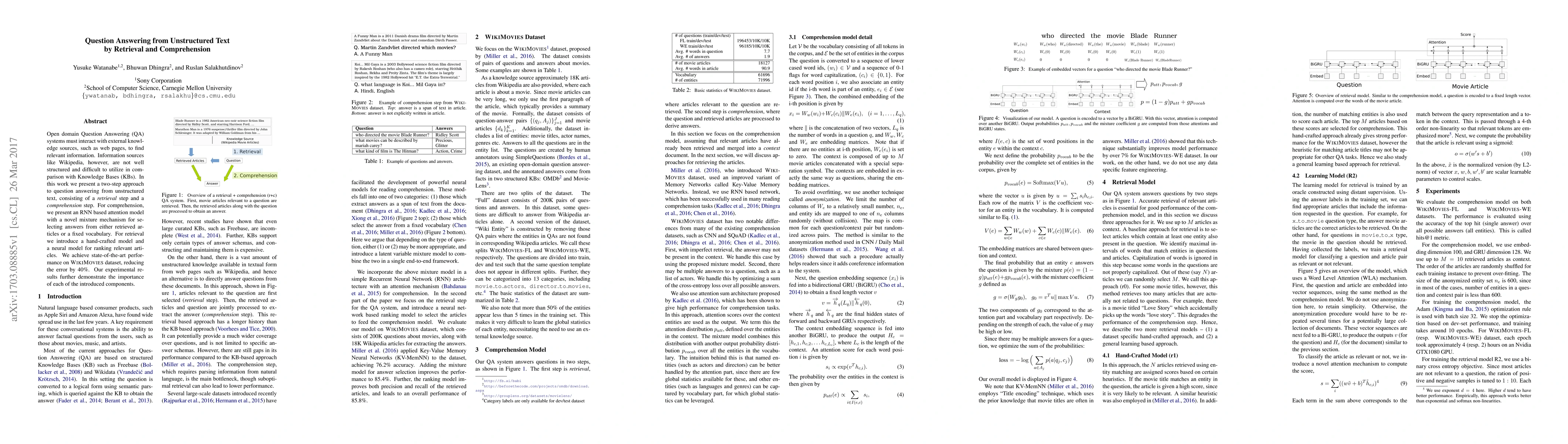 This paper proposes a two-step approach for open domain question answering from unstructured text, combining retrieval and comprehension. The comprehension step uses an RNN-based attention model with a mixture mechanism, while the retrieval step employs both hand-crafted and neural models for ranking articles. The method achieves state-of-the-art performance on the WIKIMOVIES dataset, reducing error by 40%.