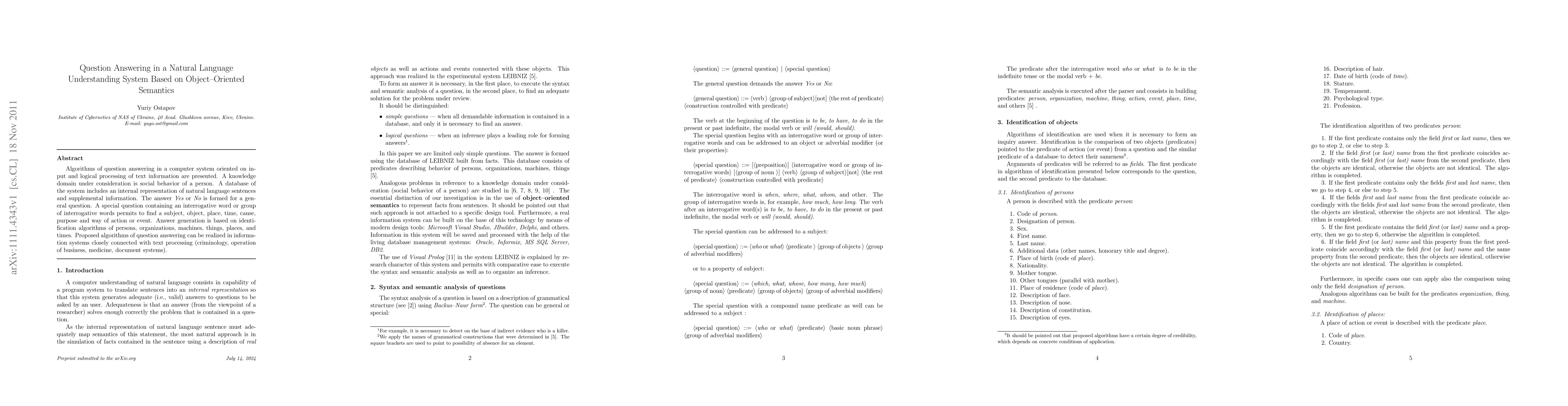 This paper presents algorithms for question answering in a natural language understanding system based on object-oriented semantics, focusing on the social behavior domain. The system uses internal representations of natural language sentences and supplemental data to generate "Yes" or "No" answers for general questions and detailed information for specific queries.