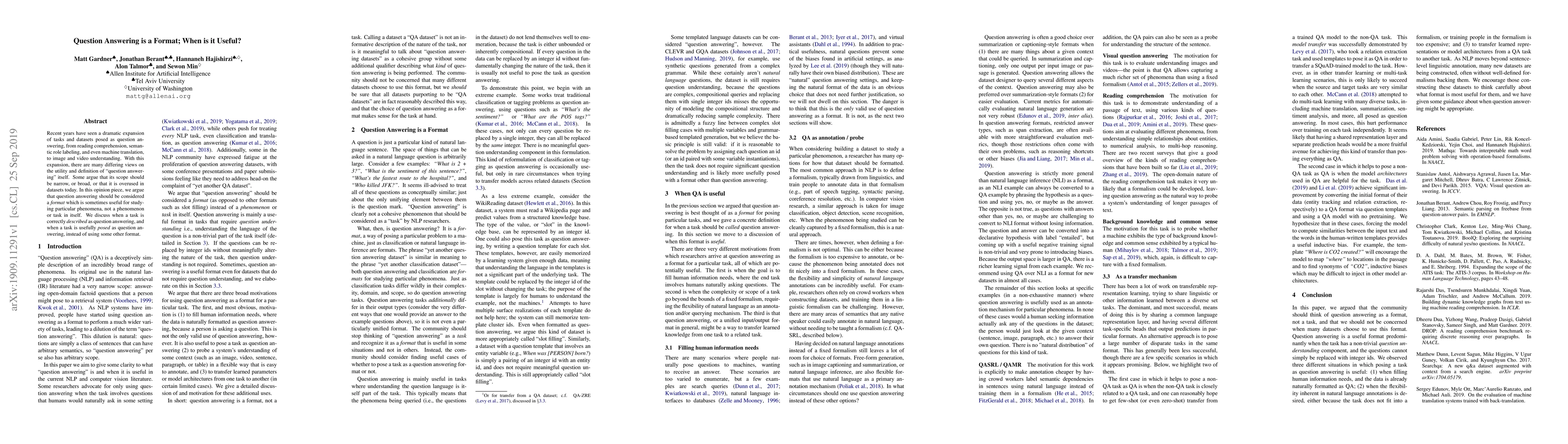 The paper presents an opinion piece arguing that 'question answering' should be viewed as a format rather than a standalone task, discussing its utility and definition in various NLP tasks.