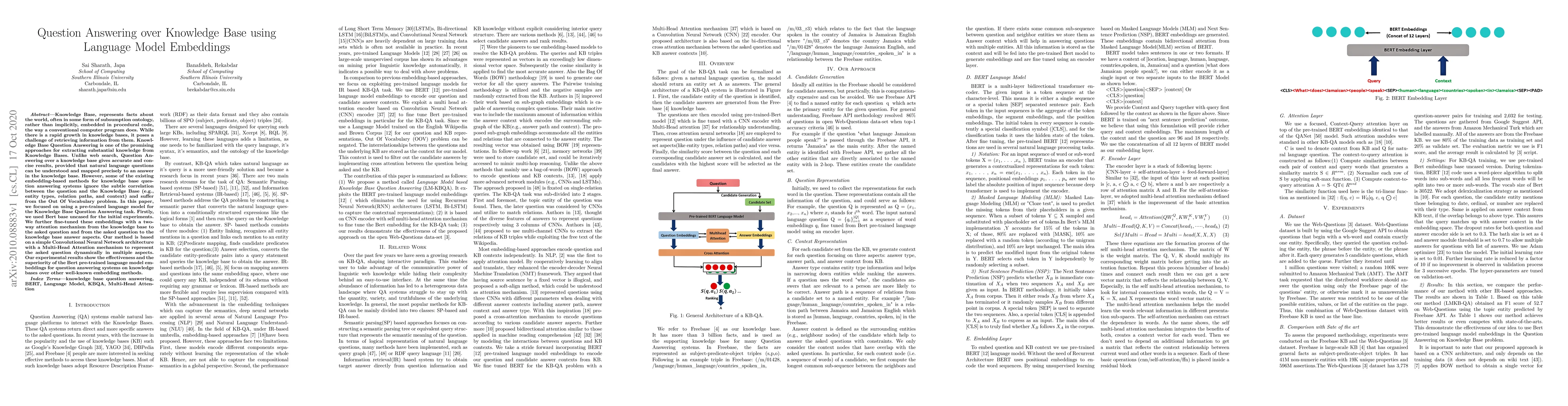 This paper investigates the use of pre-trained language model embeddings, specifically BERT, for enhancing Knowledge Base Question Answering systems. The authors fine-tune BERT embeddings with a two-way attention mechanism and show that this approach effectively captures subtle correlations between questions and knowledge bases, outperforming other embedding methods.
