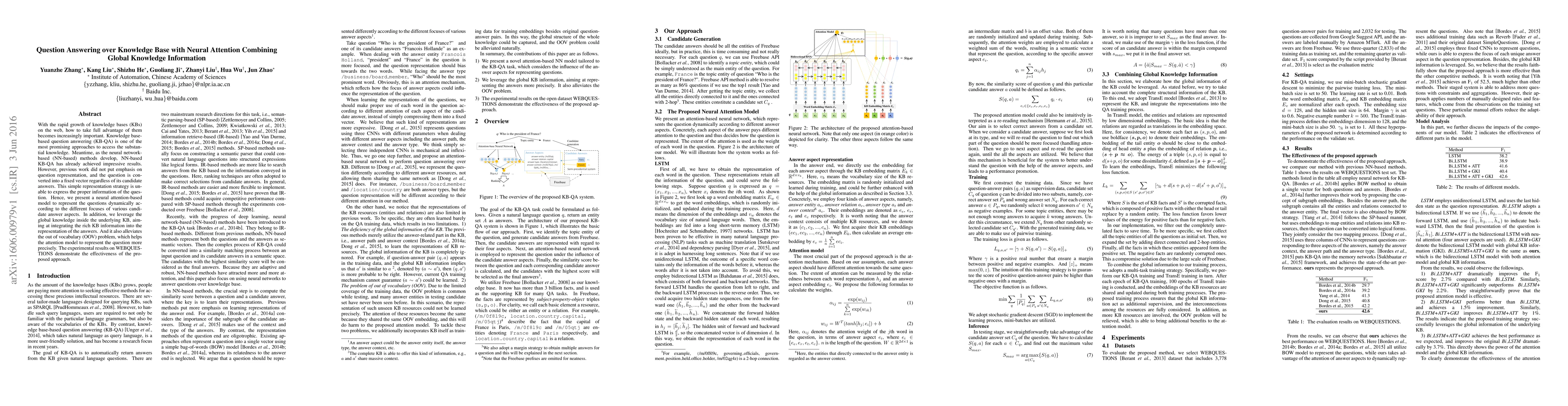 With the rapid growth of knowledge bases (KBs) on the web, how to take full advantage of them becomes increasingly important. Knowledge base-based question answering (KB-QA) is one of the most promising approaches to access the substantial knowledge. Meantime, as the neural network-based (NN-based) methods develop, NN-based KB-QA has already achieved impressive results. However, previous work did not put emphasis on question representation, and the question is converted into a fixed vector regardless of its candidate answers. This simple representation strategy is unable to express the proper information of the question. Hence, we present a neural attention-based model to represent the questions dynamically according to the different focuses of various candidate answer aspects. In addition, we leverage the global knowledge inside the underlying KB, aiming at integrating the rich KB information into the representation of the answers. And it also alleviates the out of vocabulary (OOV) problem, which helps the attention model to represent the question more precisely. The experimental results on WEBQUESTIONS demonstrate the effectiveness of the proposed approach.