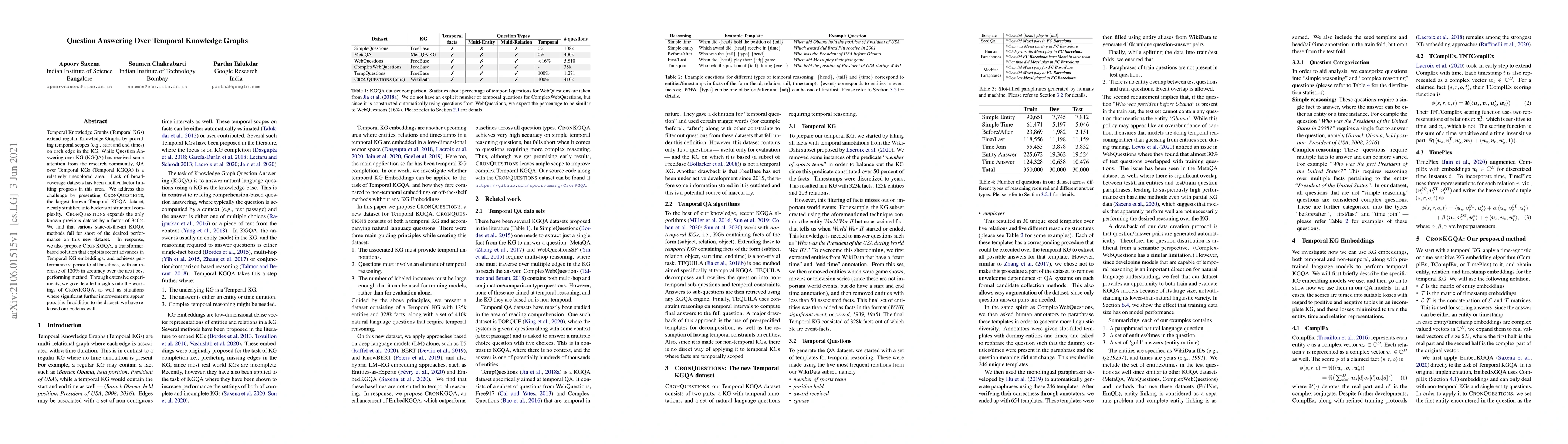 This paper introduces CRONQUESTIONS, a large dataset for Question Answering over Temporal Knowledge Graphs, which significantly expands existing datasets. It also proposes CRONKGQA, a transformer-based model that significantly outperforms prior methods by leveraging temporal embeddings, achieving a 120% accuracy improvement.
