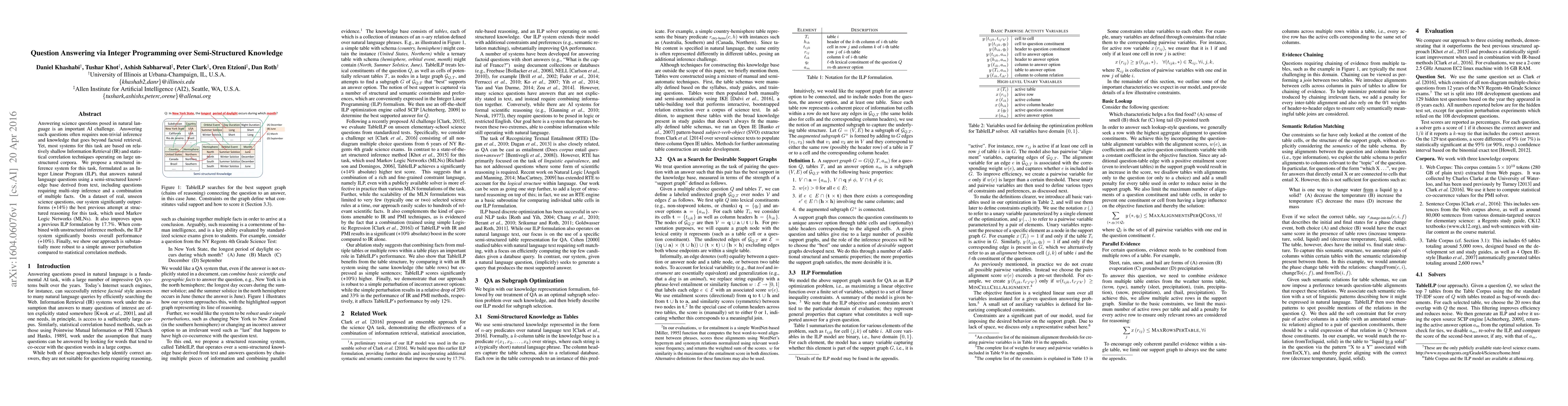 Answering science questions posed in natural language is an important AI challenge. Answering such questions often requires non-trivial inference and knowledge that goes beyond factoid retrieval. Yet, most systems for this task are based on relatively shallow Information Retrieval (IR) and statistical correlation techniques operating on large unstructured corpora. We propose a structured inference system for this task, formulated as an Integer Linear Program (ILP), that answers natural language questions using a semi-structured knowledge base derived from text, including questions requiring multi-step inference and a combination of multiple facts. On a dataset of real, unseen science questions, our system significantly outperforms (+14%) the best previous attempt at structured reasoning for this task, which used Markov Logic Networks (MLNs). It also improves upon a previous ILP formulation by 17.7%. When combined with unstructured inference methods, the ILP system significantly boosts overall performance (+10%). Finally, we show our approach is substantially more robust to a simple answer perturbation compared to statistical correlation methods.