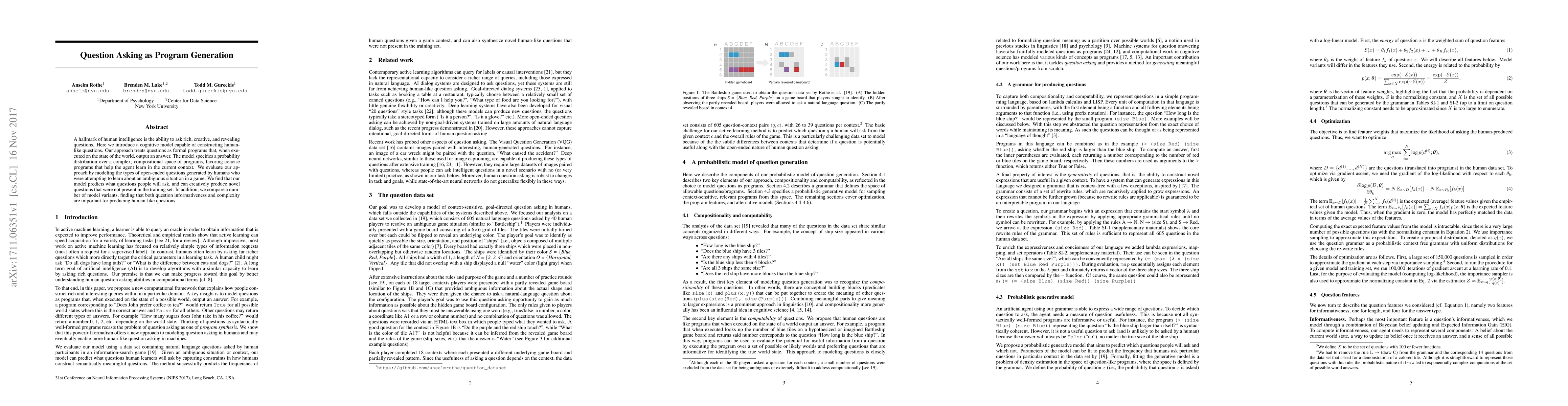 A hallmark of human intelligence is the ability to ask rich, creative, and revealing questions. Here we introduce a cognitive model capable of constructing human-like questions. Our approach treats questions as formal programs that, when executed on the state of the world, output an answer. The model specifies a probability distribution over a complex, compositional space of programs, favoring concise programs that help the agent learn in the current context. We evaluate our approach by modeling the types of open-ended questions generated by humans who were attempting to learn about an ambiguous situation in a game. We find that our model predicts what questions people will ask, and can creatively produce novel questions that were not present in the training set. In addition, we compare a number of model variants, finding that both question informativeness and complexity are important for producing human-like questions.