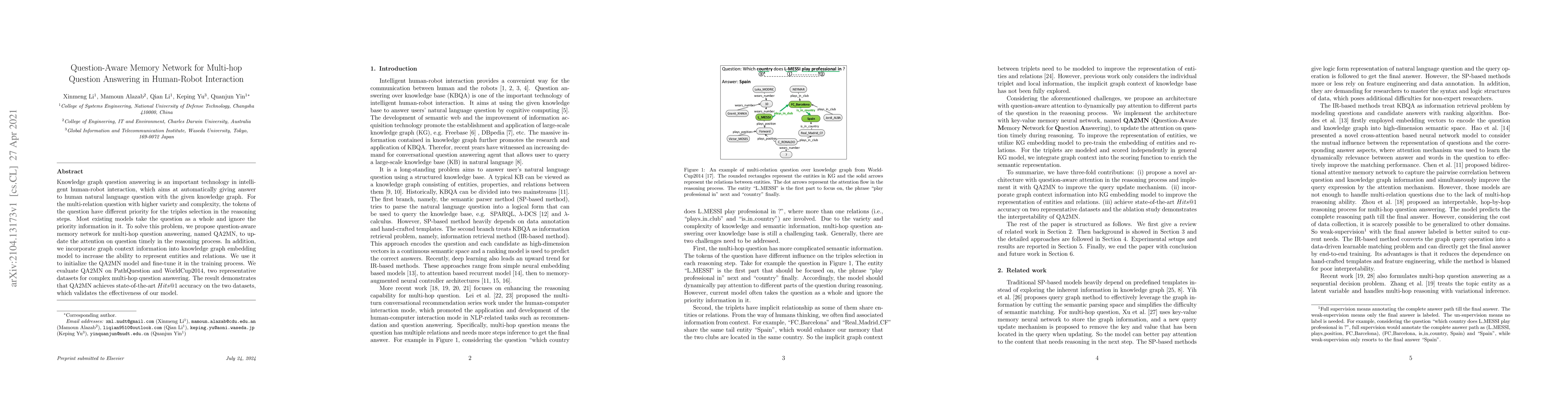 The paper proposes a question-aware memory network, QA2MN, for multi-hop question answering in human-robot interaction, addressing the issue of varying question token priorities. The model incorporates graph context information into knowledge graph embedding to enhance representation, achieving state-of-the-art accuracy on complex multi-hop question datasets.
