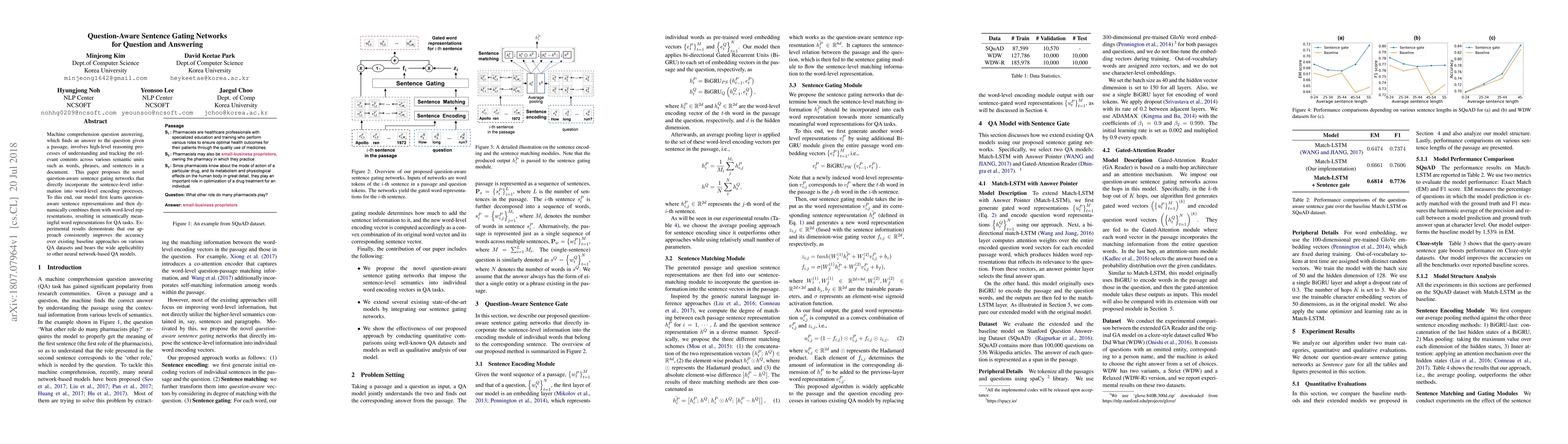 This paper introduces question-aware sentence gating networks to enhance machine comprehension for question-answering tasks by integrating sentence-level information into word-level encoding. The proposed model improves accuracy over existing methods by dynamically combining question-aware sentence representations with word representations, demonstrating wide applicability to other QA models.