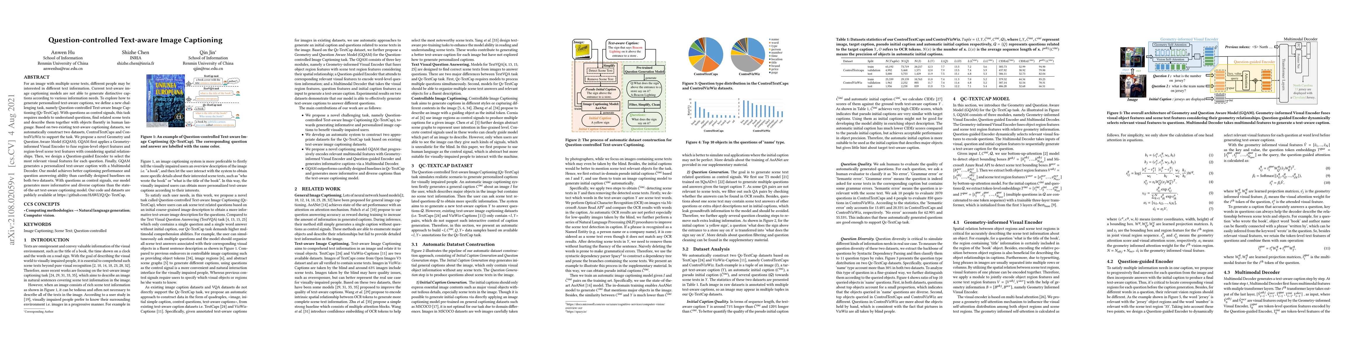 This paper introduces a new task, Question-controlled Text-aware Image Captioning (Qc-TextCap), which aims to generate personalized captions based on questions. The proposed Geometry and Question Aware Model (GQAM) fuses visual and text features considering spatial relationships and selects relevant features for each question to generate diverse and informative captions.