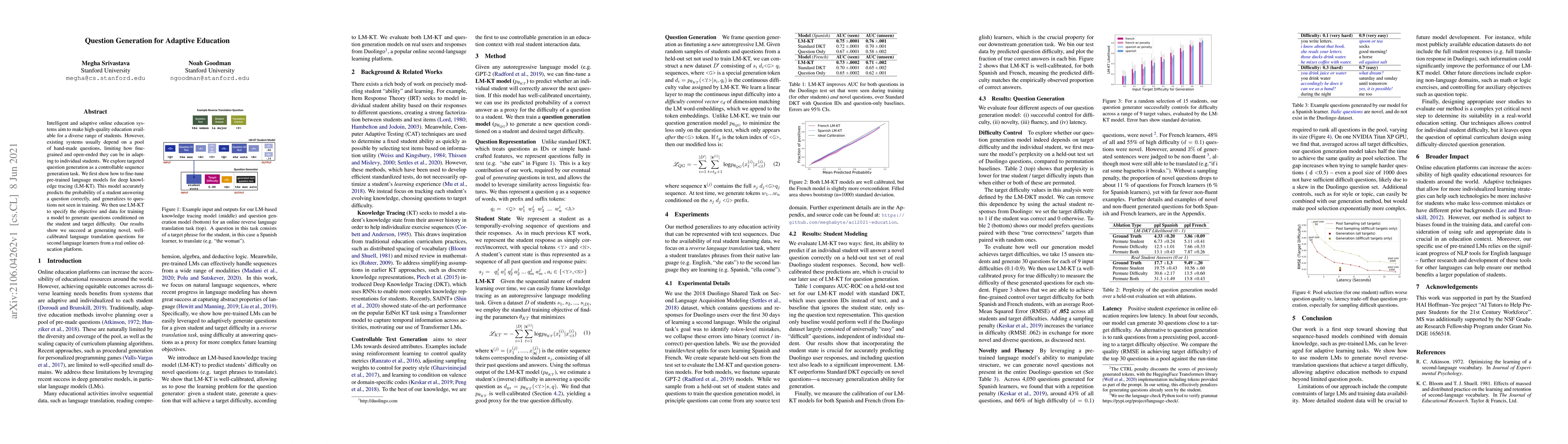 This paper investigates targeted question generation for adaptive online education systems, fine-tuning pre-trained language models for deep knowledge tracing to predict student performance. It then trains a model to generate questions tailored to individual students and target difficulty levels, successfully creating novel language translation questions for second language learners.