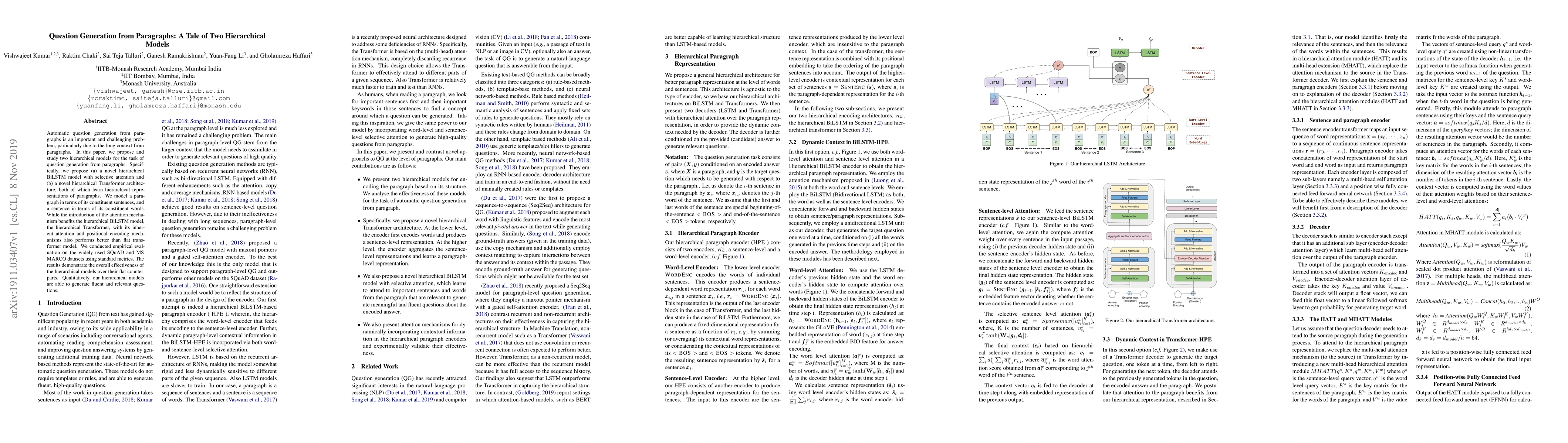 Automatic question generation from paragraphs is an important and challenging problem, particularly due to the long context from paragraphs. In this paper, we propose and study two hierarchical models for the task of question generation from paragraphs. Specifically, we propose (a) a novel hierarchical BiLSTM model with selective attention and (b) a novel hierarchical Transformer architecture, both of which learn hierarchical representations of paragraphs. We model a paragraph in terms of its constituent sentences, and a sentence in terms of its constituent words. While the introduction of the attention mechanism benefits the hierarchical BiLSTM model, the hierarchical Transformer, with its inherent attention and positional encoding mechanisms also performs better than flat transformer model. We conducted empirical evaluation on the widely used SQuAD and MS MARCO datasets using standard metrics. The results demonstrate the overall effectiveness of the hierarchical models over their flat counterparts. Qualitatively, our hierarchical models are able to generate fluent and relevant questions