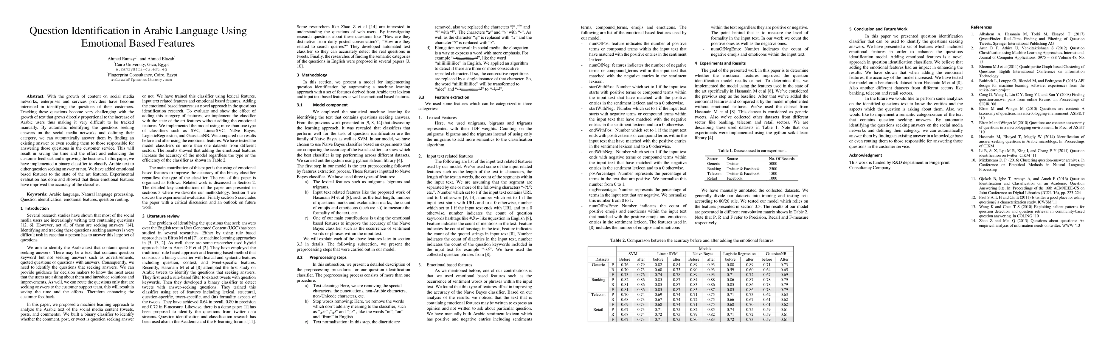 With the growth of content on social media networks, enterprises and services providers have become interested in identifying the questions of their customers. Tracking these questions become very challenging with the growth of text that grows directly proportional to the increase of Arabic users thus making it very difficult to be tracked manually. By automatic identifying the questions seeking answers on the social media networks and defining their category, we can automatically answer them by finding an existing answer or even routing them to those responsible for answering those questions in the customer service. This will result in saving the time and the effort and enhancing the customer feedback and improving the business. In this paper, we have implemented a binary classifier to classify Arabic text to either question seeking answer or not. We have added emotional based features to the state of the art features. Experimental evaluation has done and showed that these emotional features have improved the accuracy of the classifier.