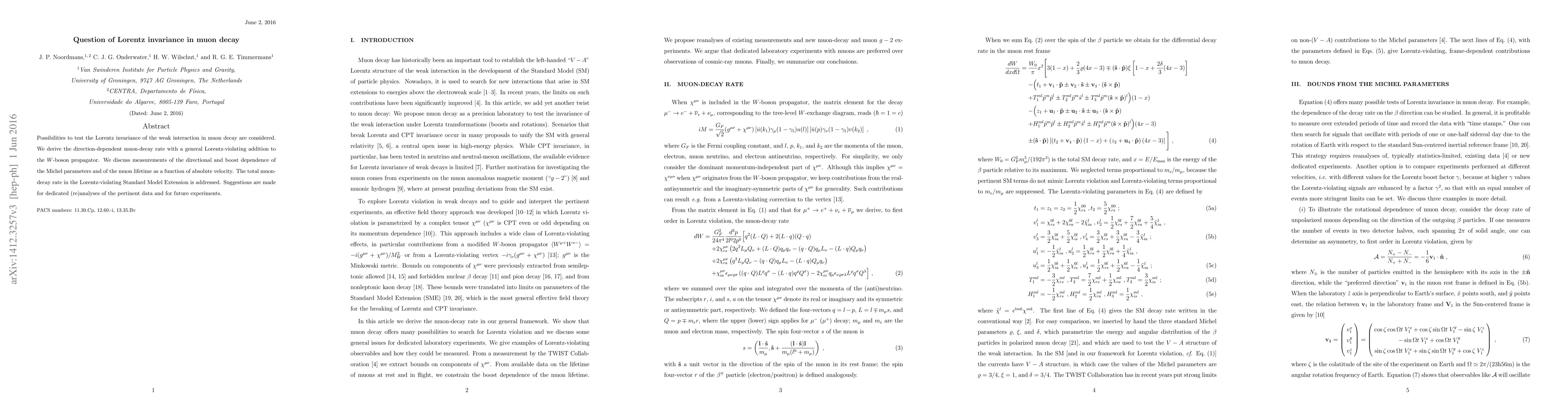 This paper explores the potential to test Lorentz invariance in muon decay by introducing a Lorentz-violating term in the W-boson propagator. It proposes methods to measure the directional and velocity-dependent decay rates and suggests re-analyses of existing data and future experiments to investigate these effects.