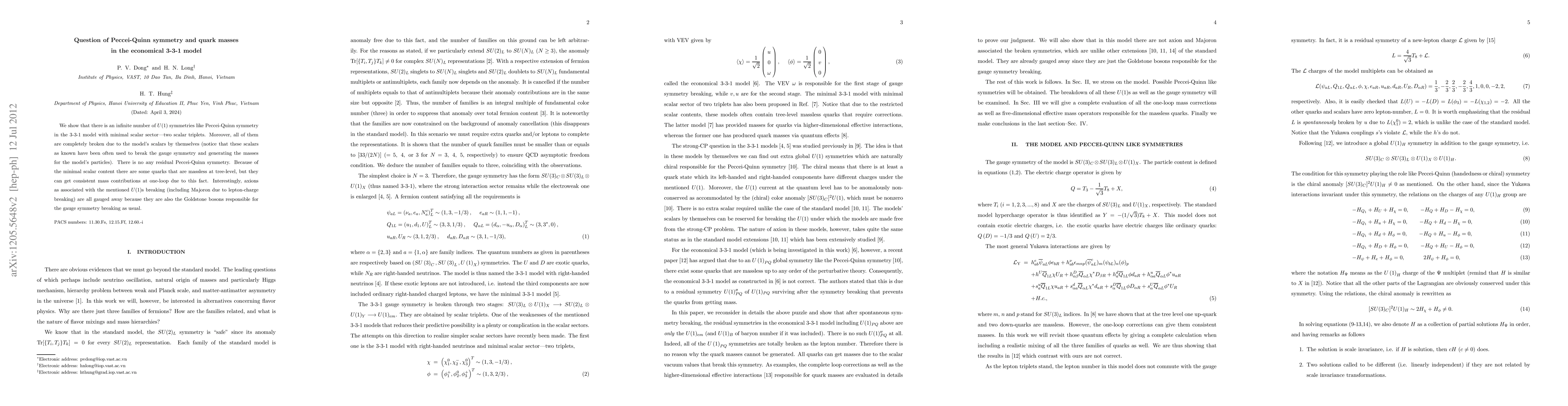 We show that there is an infinite number of U(1) symmetries like Peccei-Quinn symmetry in the 3-3-1 model with minimal scalar sector---two scalar triplets. Moreover, all of them are completely broken due to the model's scalars by themselves (notice that these scalars as known have been often used to break the gauge symmetry and generating the masses for the model's particles). There is no any residual Peccei-Quinn symmetry. Because of the minimal scalar content there are some quarks that are massless at tree-level, but they can get consistent mass contributions at one-loop due to this fact. Interestingly, axions as associated with the mentioned U(1)s breaking (including Majoron due to lepton-charge breaking) are all gauged away because they are also the Goldstone bosons responsible for the gauge symmetry breaking as usual.