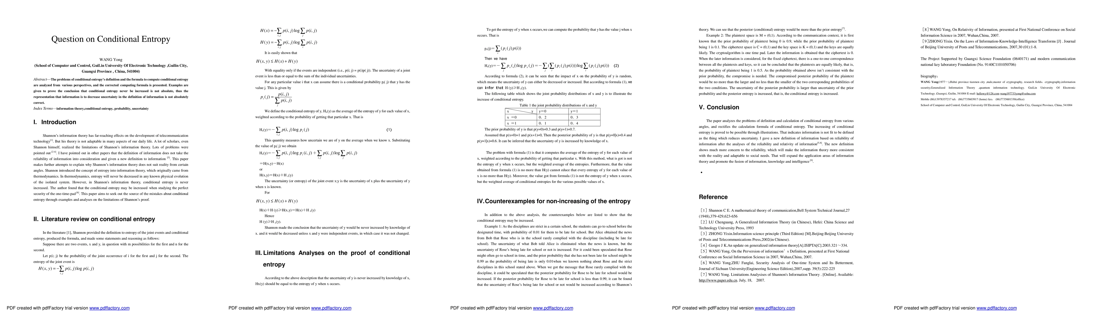 This paper corrects the formula for computing conditional entropy and demonstrates that the assertion that conditional entropy never increases is not universally true. It argues that the representation of information decreasing uncertainty is not always accurate.