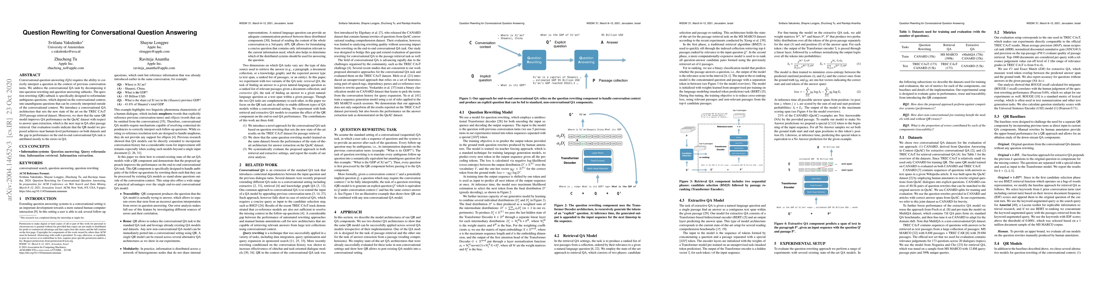 Conversational question answering (QA) requires the ability to correctly interpret a question in the context of previous conversation turns. We address the conversational QA task by decomposing it into question rewriting and question answering subtasks. The question rewriting (QR) subtask is specifically designed to reformulate ambiguous questions, which depend on the conversational context, into unambiguous questions that can be correctly interpreted outside of the conversational context. We introduce a conversational QA architecture that sets the new state of the art on the TREC CAsT 2019 passage retrieval dataset. Moreover, we show that the same QR model improves QA performance on the QuAC dataset with respect to answer span extraction, which is the next step in QA after passage retrieval. Our evaluation results indicate that the QR model we proposed achieves near human-level performance on both datasets and the gap in performance on the end-to-end conversational QA task is attributed mostly to the errors in QA.