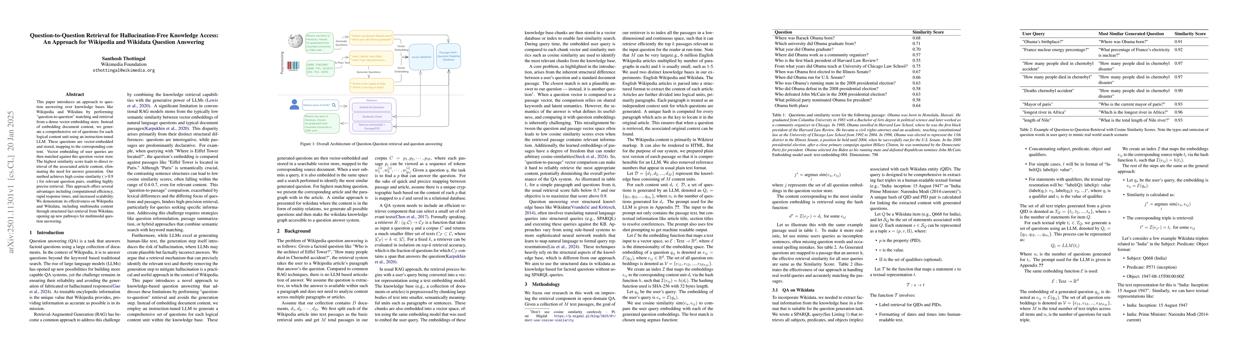 This paper proposes a method for question answering over Wikipedia and Wikidata by embedding and retrieving questions rather than documents, achieving precise retrieval with high cosine similarity and demonstrating computational efficiency, rapid response times, and scalability.