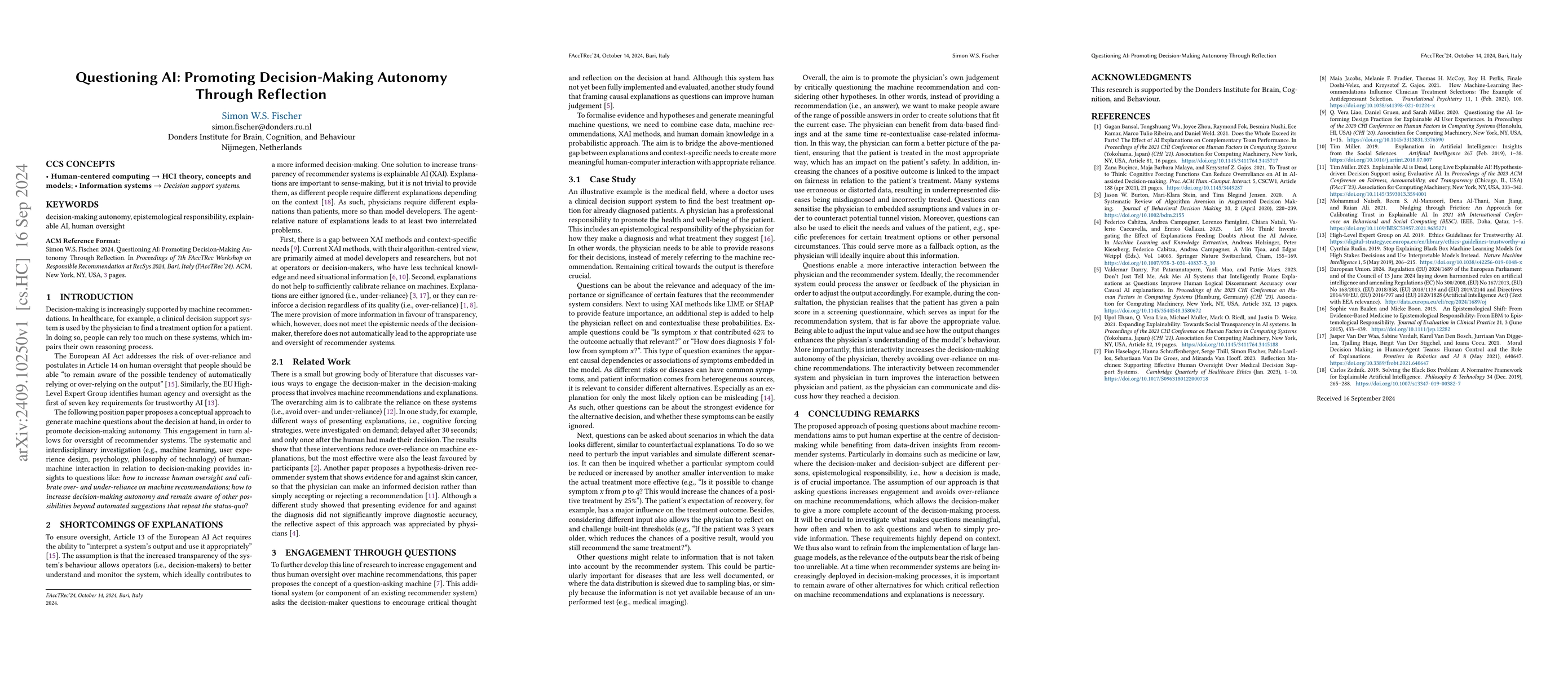 Decision-making is increasingly supported by machine recommendations. In healthcare, for example, a clinical decision support system is used by the physician to find a treatment option for a patient. In doing so, people can rely too much on these systems, which impairs their own reasoning process. The European AI Act addresses the risk of over-reliance and postulates in Article 14 on human oversight that people should be able "to remain aware of the possible tendency of automatically relying or over-relying on the output". Similarly, the EU High-Level Expert Group identifies human agency and oversight as the first of seven key requirements for trustworthy AI. The following position paper proposes a conceptual approach to generate machine questions about the decision at hand, in order to promote decision-making autonomy. This engagement in turn allows for oversight of recommender systems. The systematic and interdisciplinary investigation (e.g., machine learning, user experience design, psychology, philosophy of technology) of human-machine interaction in relation to decision-making provides insights to questions like: how to increase human oversight and calibrate over- and under-reliance on machine recommendations; how to increase decision-making autonomy and remain aware of other possibilities beyond automated suggestions that repeat the status-quo?
