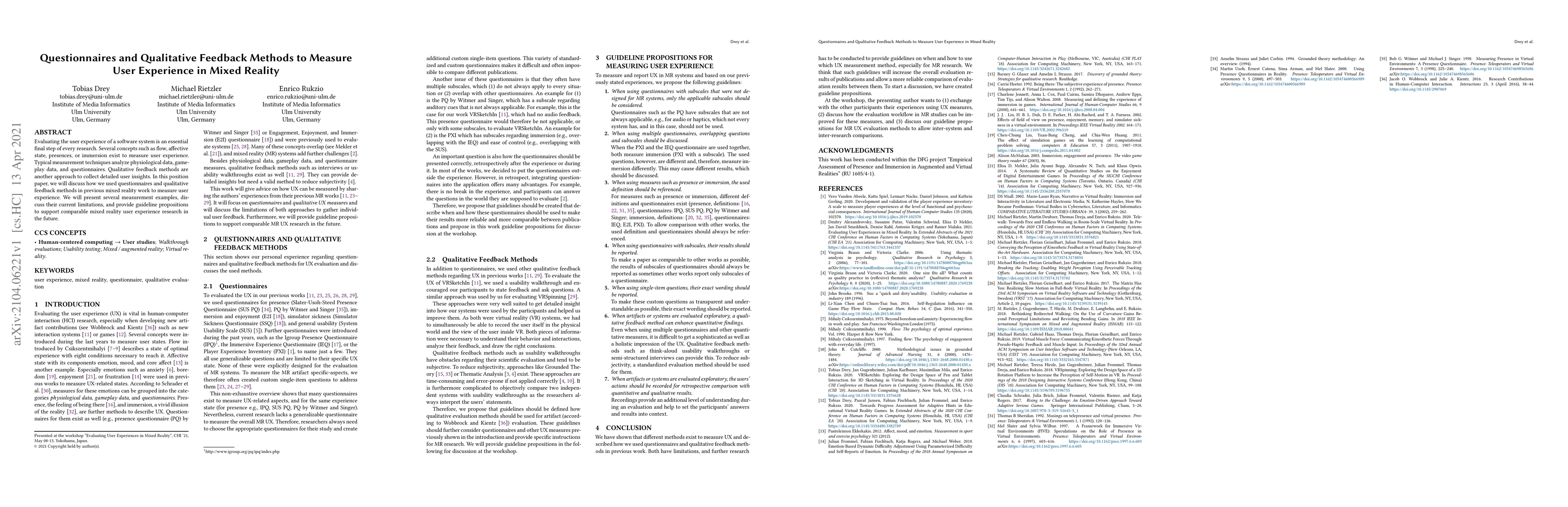 This research paper discusses the use of questionnaires and qualitative feedback methods to measure user experience in mixed reality, highlighting current limitations and providing guidelines for future research. It aims to improve the understanding of user experience in this field by presenting measurement examples and propositions.