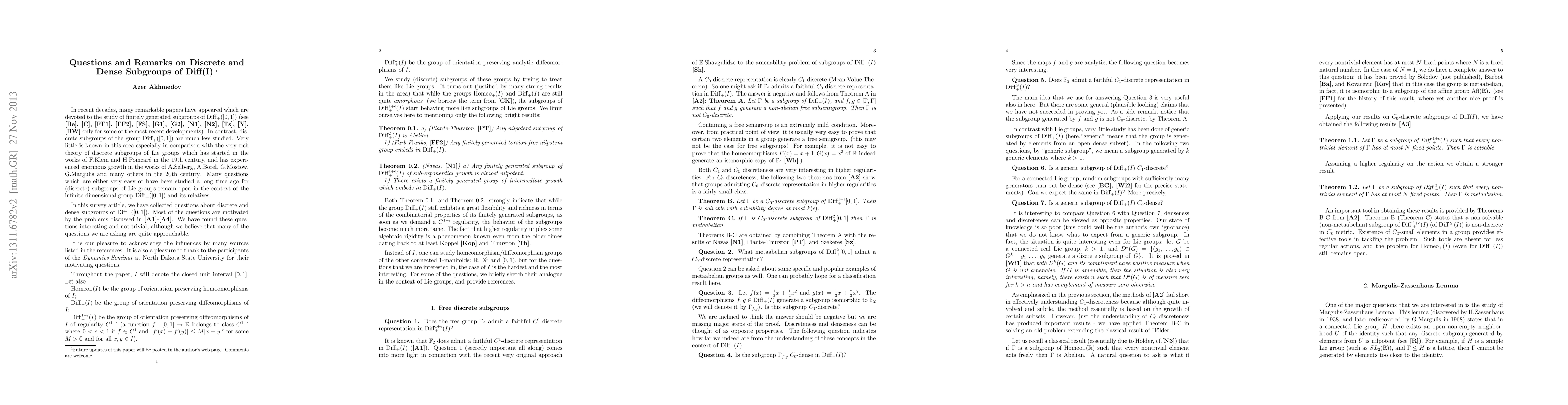 This paper raises questions about discrete and dense subgroups of Diff(I), a mathematical concept related to geometric transformations. It focuses on unresolved problems from previous research and invites discussion and further exploration in the field.