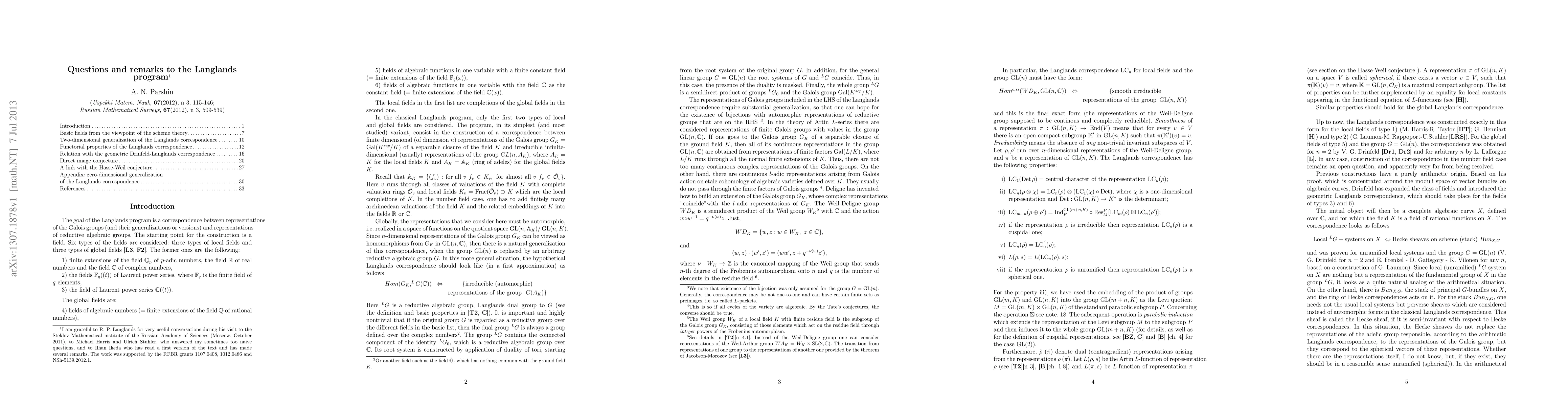 This paper surveys the classical Langlands correspondence and explores its generalization to higher-dimensional fields, proposing a conjecture linking 2D and 1D representations. It suggests that this conjecture supports the classical Hasse-Weil conjecture regarding L-functions of curves over global fields.