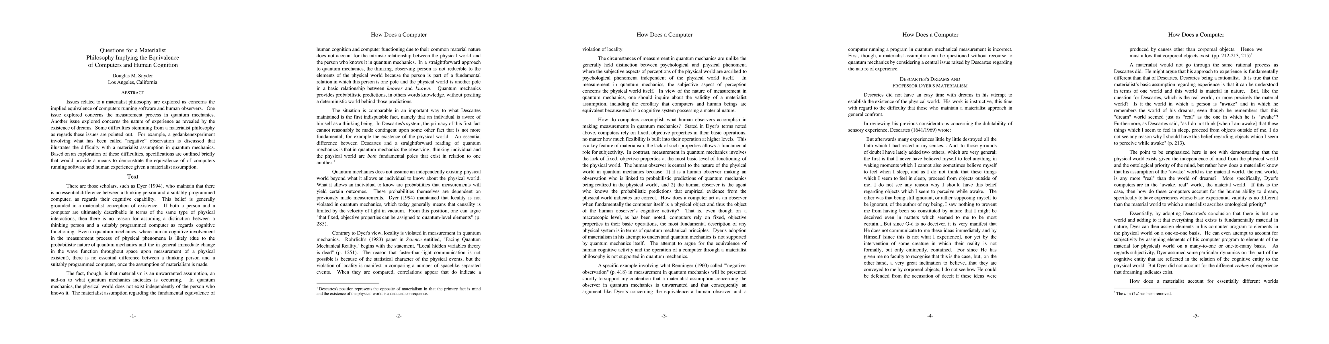 Issues related to a materialist philosophy are explored as concerns the implied equivalence of computers running software and human observers. One issue explored concerns the measurement process in quantum mechanics. Another issue explored concerns the nature of experience as revealed by the existence of dreams. Some difficulties stemming from a materialist philosophy as regards these issues are pointed out. For example, a gedankenexperiment involving what has been called "negative" observation is discussed that illustrates the difficulty with a materialist assumption in quantum mechanics. Based on an exploration of these difficulties, specifications are outlined briefly that would provide a means to demonstrate the equivalence of of computers running software and human experience given a materialist assumption.