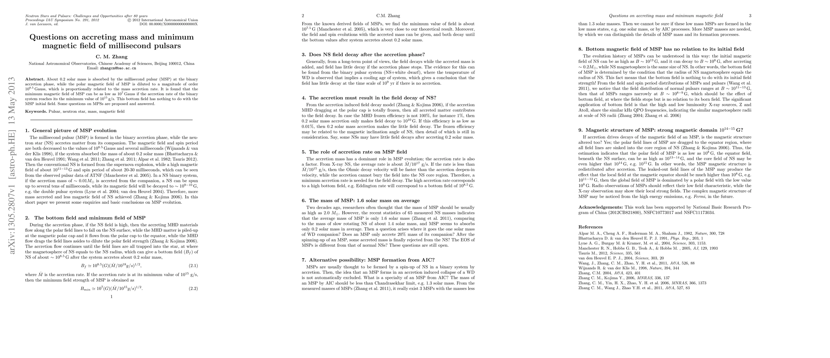 Summary: This paper investigates the accretion process in millisecond pulsars (MSPs), finding that they can absorb about 0.2 solar masses during binary accretion, reducing their magnetic field to around 10^8.5 Gauss. It concludes that the minimum magnetic field can drop to 10^7 Gauss if the accretion rate reaches 10^15 g/s, independent of the initial MSP field.