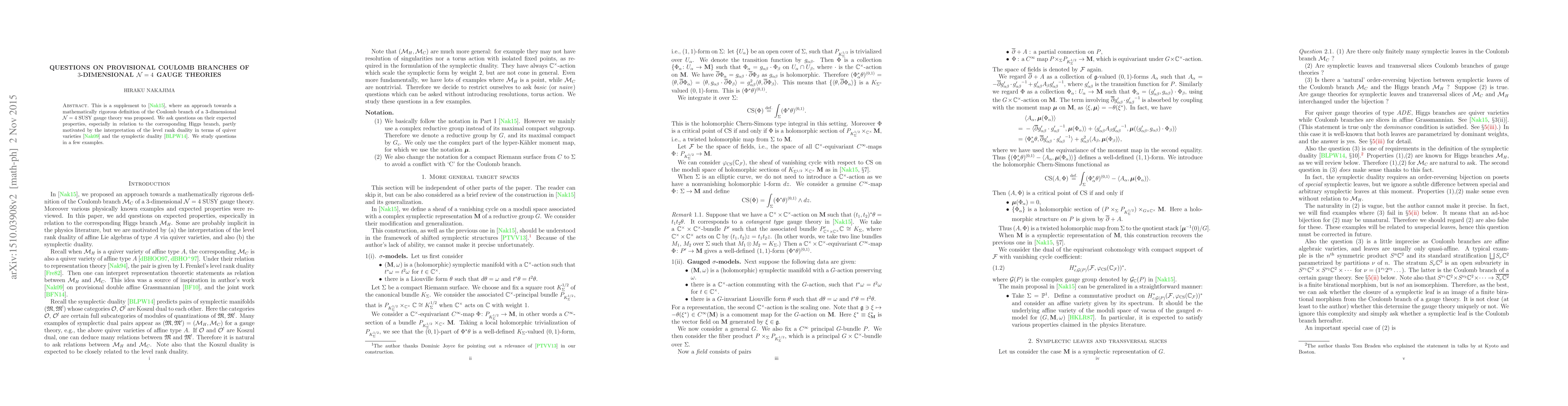 This is a supplement to [arXiv:1503.03676], where an approach towards a mathematically rigorous definition of the Coulomb branch of a $3$-dimensional $\mathcal N=4$ SUSY gauge theory was proposed. We ask questions on their expected properties, especially in relation to the corresponding Higgs branch, partly motivated by the interpretation of the level rank duality in terms of quiver varieties [arXiv:0809.2605] and the symplectic duality [arXiv:1407.0964]. We study questions in a few examples.