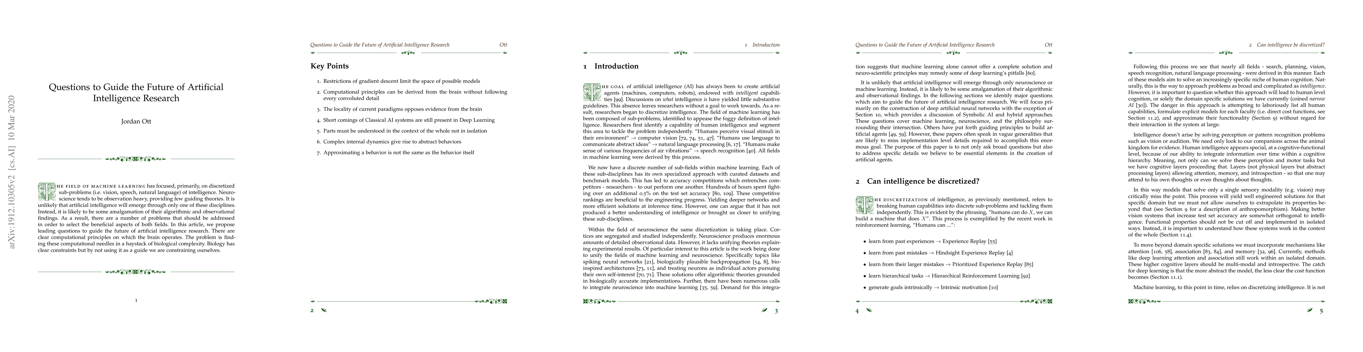 The field of machine learning has focused, primarily, on discretized sub-problems (i.e. vision, speech, natural language) of intelligence. While neuroscience tends to be observation heavy, providing few guiding theories. It is unlikely that artificial intelligence will emerge through only one of these disciplines. Instead, it is likely to be some amalgamation of their algorithmic and observational findings. As a result, there are a number of problems that should be addressed in order to select the beneficial aspects of both fields. In this article, we propose leading questions to guide the future of artificial intelligence research. There are clear computational principles on which the brain operates. The problem is finding these computational needles in a haystack of biological complexity. Biology has clear constraints but by not using it as a guide we are constraining ourselves.