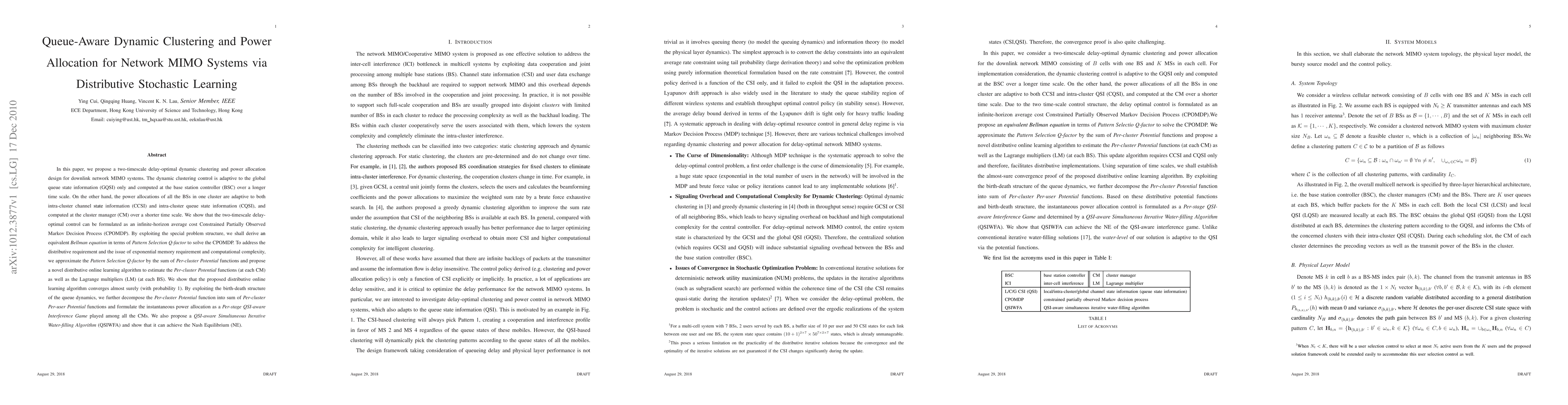 This paper proposes a two-timescale dynamic clustering and power allocation strategy for network MIMO systems, optimizing delay-optimal control via distributive stochastic learning. The approach leverages global queue state information for clustering and channel/queue state information for power allocation, formulated as a CPOMDP and solved using a novel distributive online learning algorithm.