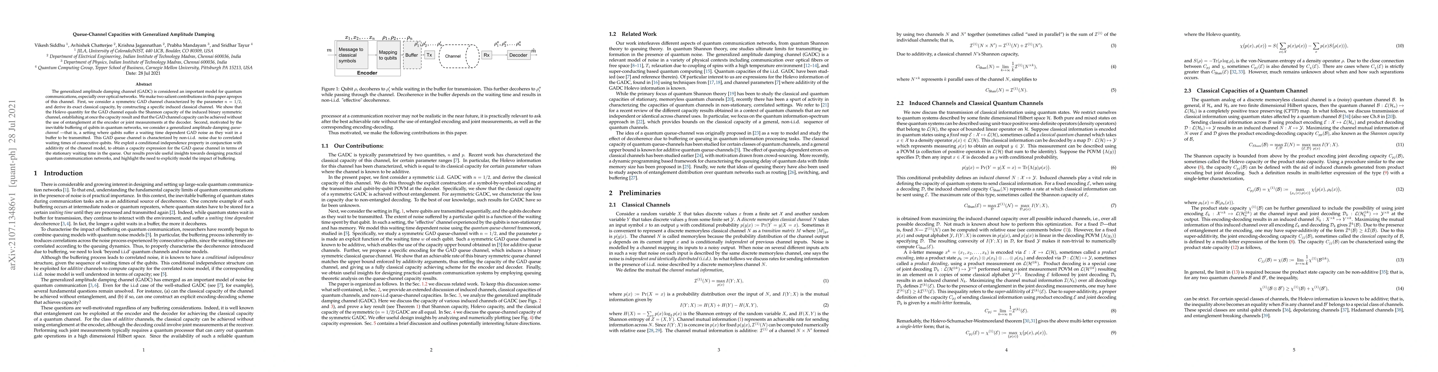 The generalized amplitude damping channel (GADC) is considered an important model for quantum communications, especially over optical networks. We make two salient contributions in this paper apropos of this channel. First, we consider a symmetric GAD channel characterized by the parameter $n=1/2,$ and derive its exact classical capacity, by constructing a specific induced classical channel. We show that the Holevo quantity for the GAD channel equals the Shannon capacity of the induced binary symmetric channel, establishing at once the capacity result and that the GAD channel capacity can be achieved without the use of entanglement at the encoder or joint measurements at the decoder. Second, motivated by the inevitable buffering of qubits in quantum networks, we consider a generalized amplitude damping \emph{queue-channel} -- that is, a setting where qubits suffer a waiting time dependent GAD noise as they wait in a buffer to be transmitted. This GAD queue channel is characterized by non-i.i.d. noise due to correlated waiting times of consecutive qubits. We exploit a conditional independence property in conjunction with additivity of the channel model, to obtain a capacity expression for the GAD queue channel in terms of the stationary waiting time in the queue. Our results provide useful insights towards designing practical quantum communication networks, and highlight the need to explicitly model the impact of buffering.
