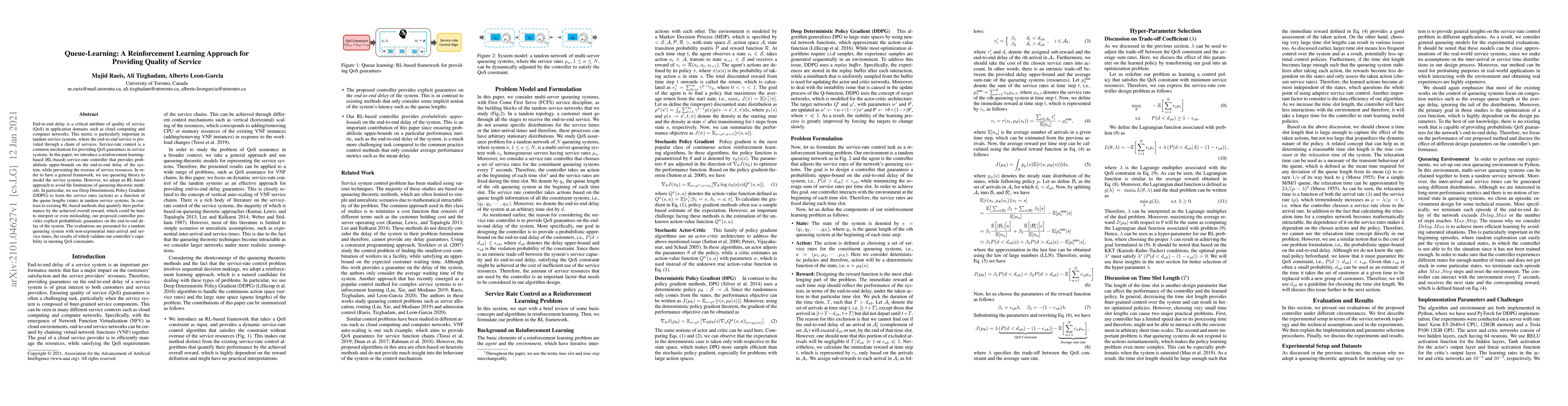 End-to-end delay is a critical attribute of quality of service (QoS) in application domains such as cloud computing and computer networks. This metric is particularly important in tandem service systems, where the end-to-end service is provided through a chain of services. Service-rate control is a common mechanism for providing QoS guarantees in service systems. In this paper, we introduce a reinforcement learning-based (RL-based) service-rate controller that provides probabilistic upper-bounds on the end-to-end delay of the system, while preventing the overuse of service resources. In order to have a general framework, we use queueing theory to model the service systems. However, we adopt an RL-based approach to avoid the limitations of queueing-theoretic methods. In particular, we use Deep Deterministic Policy Gradient (DDPG) to learn the service rates (action) as a function of the queue lengths (state) in tandem service systems. In contrast to existing RL-based methods that quantify their performance by the achieved overall reward, which could be hard to interpret or even misleading, our proposed controller provides explicit probabilistic guarantees on the end-to-end delay of the system. The evaluations are presented for a tandem queueing system with non-exponential inter-arrival and service times, the results of which validate our controller's capability in meeting QoS constraints.