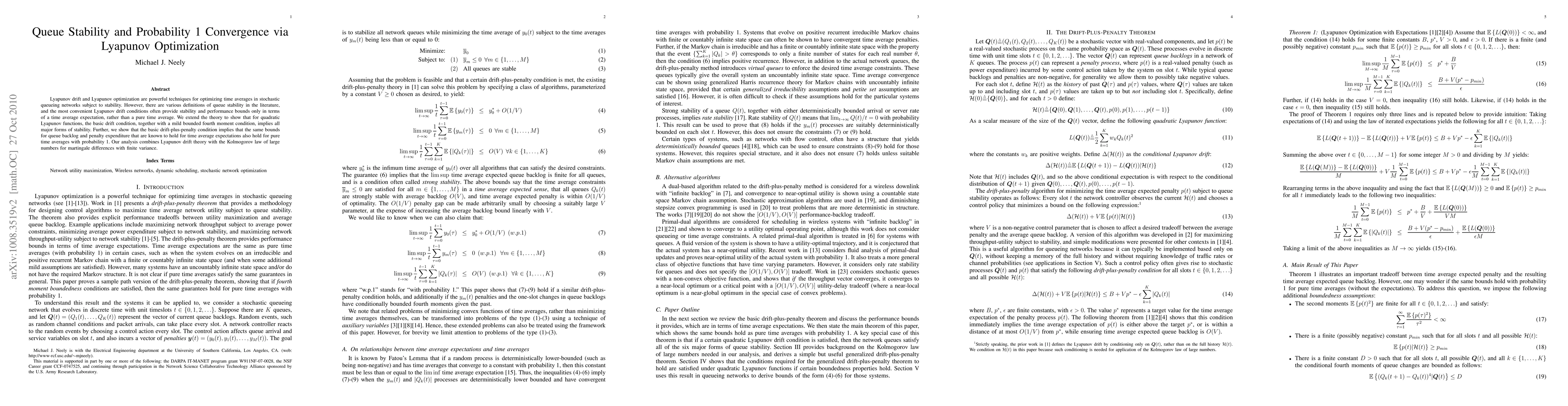 This research paper extends Lyapunov optimization theory to show that quadratic Lyapunov functions with mild bounded fourth moment conditions ensure queue stability in stochastic networks. It also demonstrates probability 1 convergence for pure time averages.