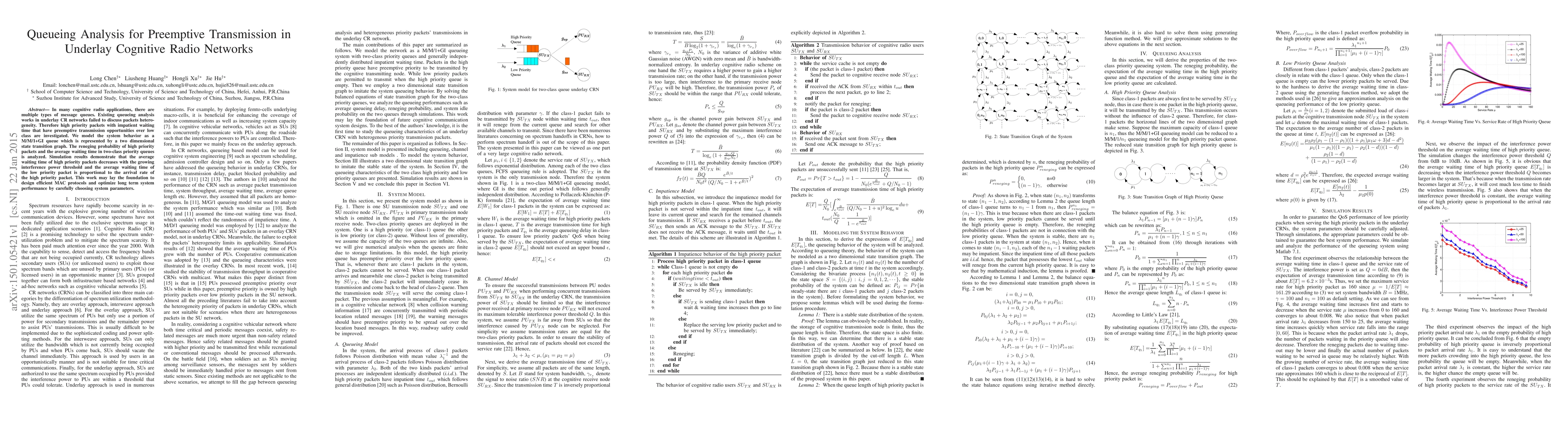 This paper analyzes preemptive transmission in underlay cognitive radio networks, focusing on heterogeneous message queues. It models the system as a M/M/1+GI queue with a two-dimensional state transition graph, examining the reneging probability and average waiting times for high and low priority packets. Simulation results show that higher interference thresholds reduce high priority waiting times, while low priority waiting times correlate with high priority arrival rates.